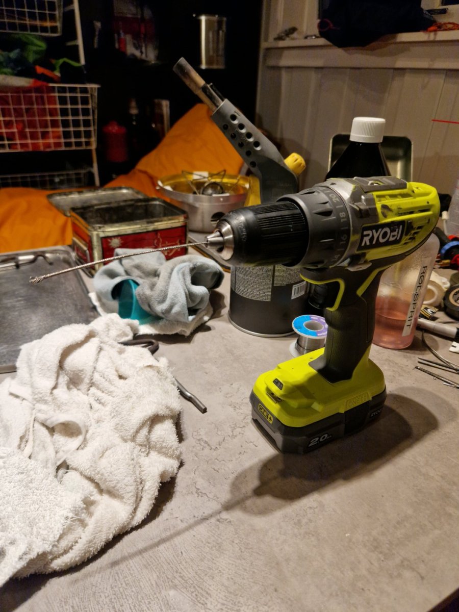 6. Høvik verk 210 har fungert etter det fikk seg et primusbad, men vel vitende om at det har sittet igjen en del sot inne i brennerhode. Har måtte stikket opp dysen noen ganger for å få den til å gå for full effekt. Klar over problemet har jeg brukt den til koking av vann/kaffe utendørs. Vet mange har brukt metoder der de varmer opp brenner til den er rødglødende og dunker den i vann. En metode som helt sikkert fungere, men jeg er noe usikker på om metallet liker det så veldig godt. Fikk et lurt tips av en primuskar, sykkelwier i drillen. Nå har jeg brukt denne metoden på 210'n samt skyllet den mange ganger med rødsprit. Nå er stjerneskudd borte og dysen blokkeres ikke lengre. Kan godt være at dette tipset er kjent men jeg deler det likevel. Klemte tuppen av wieren med tang slik at den skulle ta bedre. sykkelwier i drillen fungere som en liten børste i stigrørene.