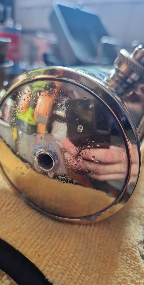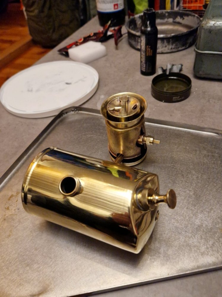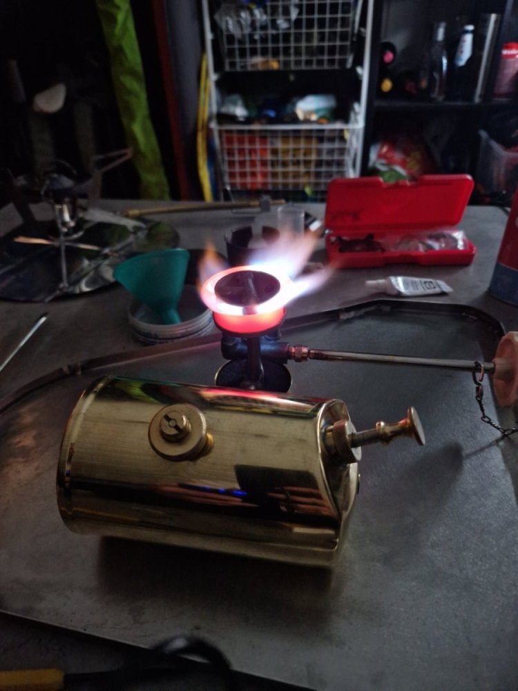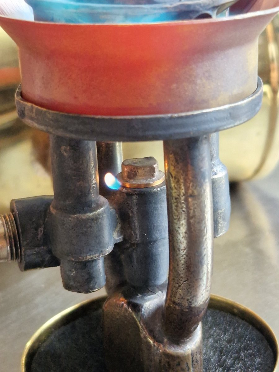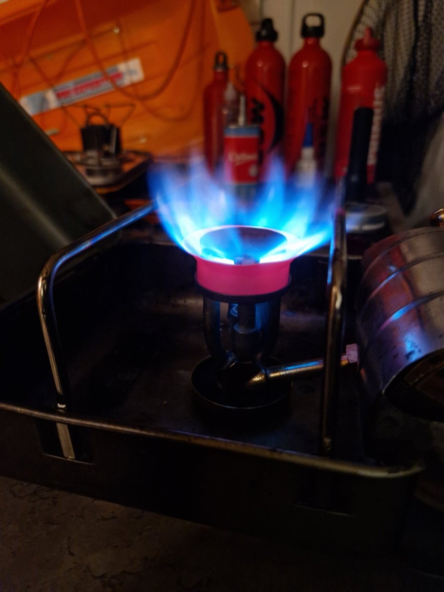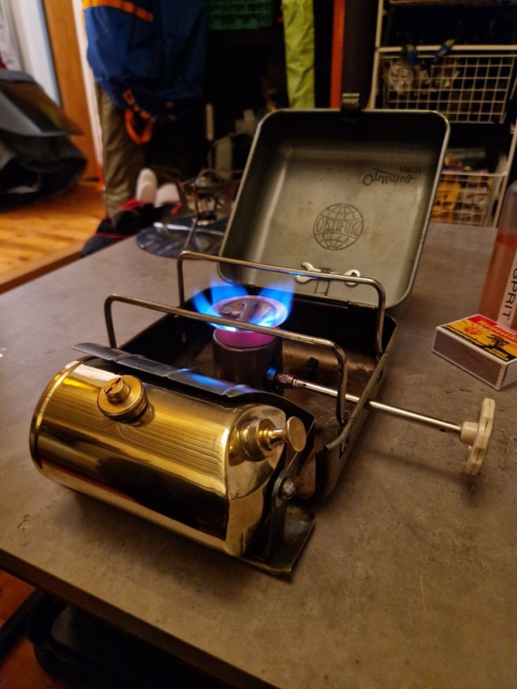 Det ble liv i den etter hvert, oppdaget lekkasje under trykktesting mellom drivstoff tank og røret til brenner. Viste seg å være en liten skade på konen til brenneren. Fant et egnet emne som passet mot konen som jeg fikk satt i drillen. Noen runde mer 3m scotch brite så ble den tett.