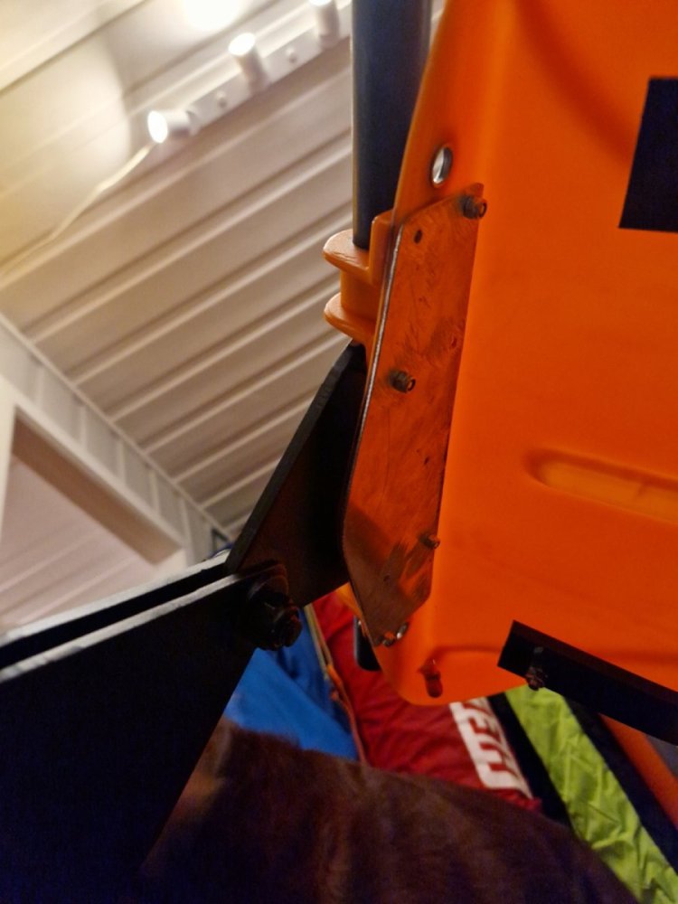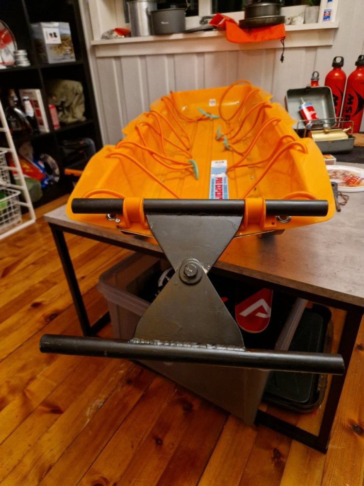 Flere forberedelser frem mot påske. Guttungen og jeg skal ta noen dager i Femundsmarka på starten av påska. Da er jeg avhengi av å dra både barnepulk og pakkpulk. I dag laget jeg en forsterkningsplate i 1.5mm aluminium til dragfestene som skal festes på en pariserpulk. Brukte en 130cm pakkpulk til samme jobb før, men de ekstra 20cm er verdt å ha når man pakker for 3(hund er med). Test montering, tomt for 4mm popnagler. Kopi av fjellpulken sin sammenkobling for to pulker. Noe jeg heiv sammen av bromdeler på jobb en stund tilbake, fungerer ypperlig. Sitter dragfester i bakenden på barnepulken- 150 svar