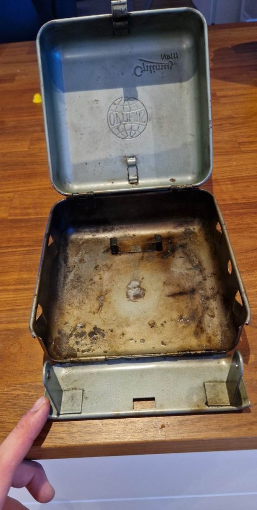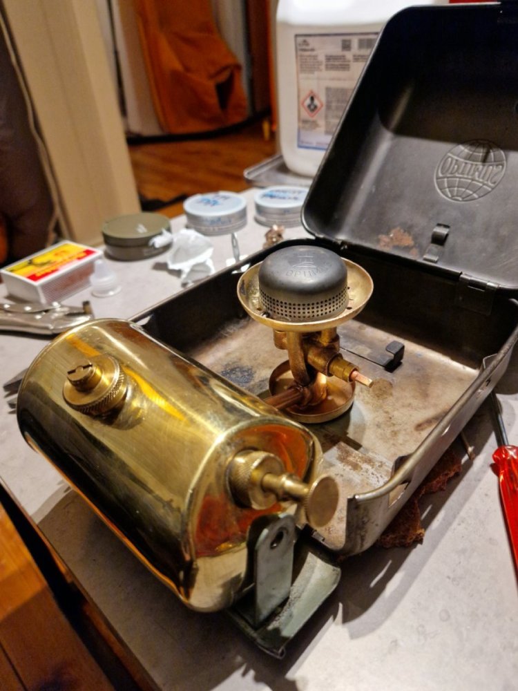 Har ønsket meg en Optimus 111 i lengre tid, men rett å slett ikke rotet meg til å kjøpe en. Ønsket meg en eldre utgave der kassen har logo preget på lokket, endelig dukket det opp en til en kurrant pris. Rep-kit og NRV-verktøy er på vei, skal bli fint å få liv i den! Demontering.Hel kasse uten for mange skader.Sitronsyre, zalo og varmt vann gjør jobben. Mange gamle minner blir borte, men nye skal lages.Autosol og litt tålmodighet.Nå trenger den bare nye pakninger og brensel på tanken.