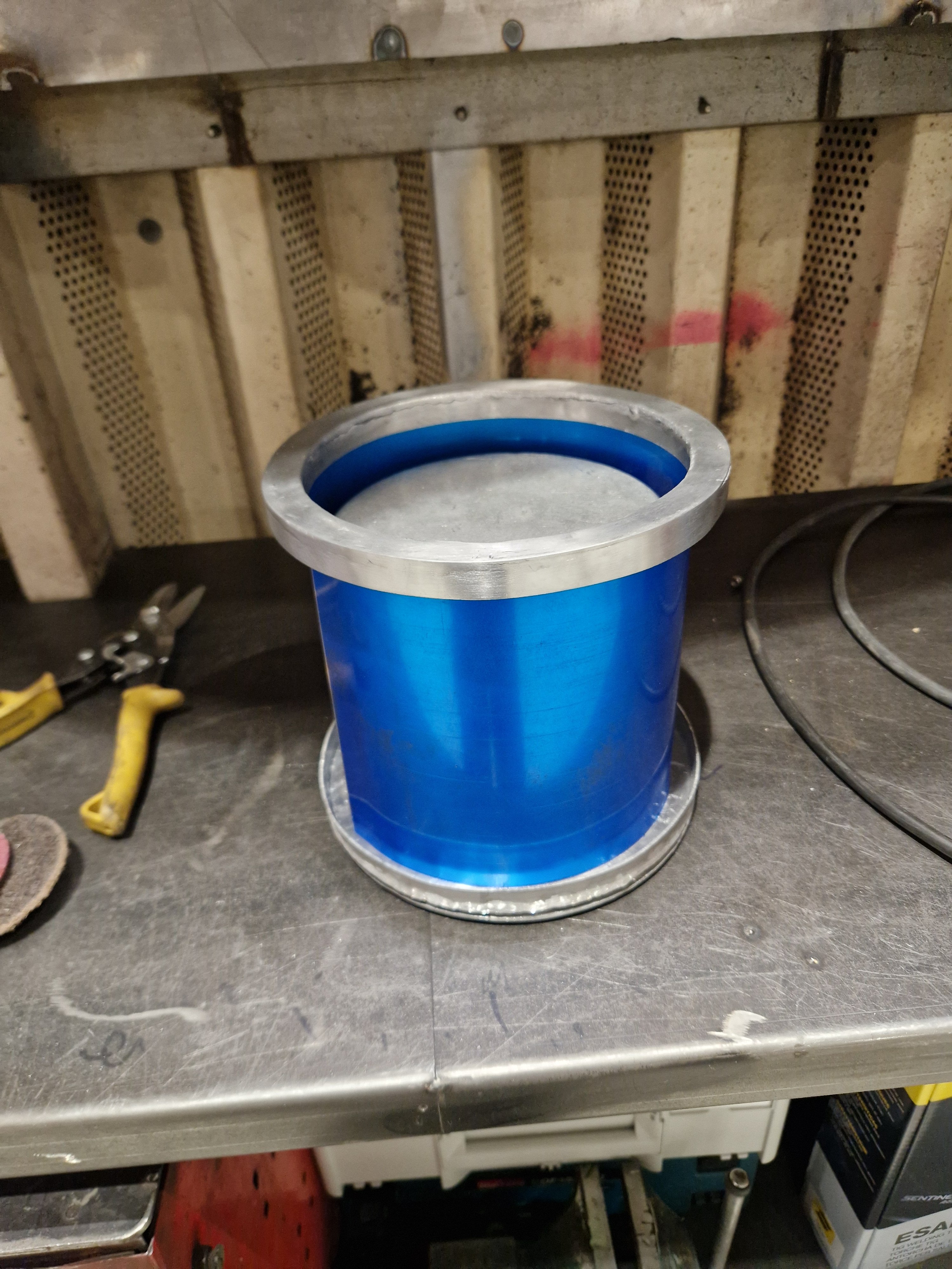 Takk for hyggelig tilbakemelding Har jobbet litt med selve kjelen i dag, siden dette var i utgangspunktet et bærspann så var det 4 hull i den som festet hanken. Disse hullene sveiset jeg igjen for en stund siden. Har bearbeidet sveisen noe men ikke helt ferdig og jeg har tatt av litt av godstykkelsen, fått fjernet nesten 30gram så langt. En litt jevnere finish enn tidligere