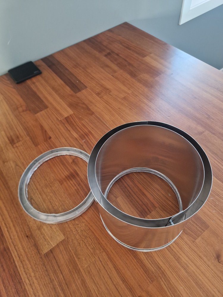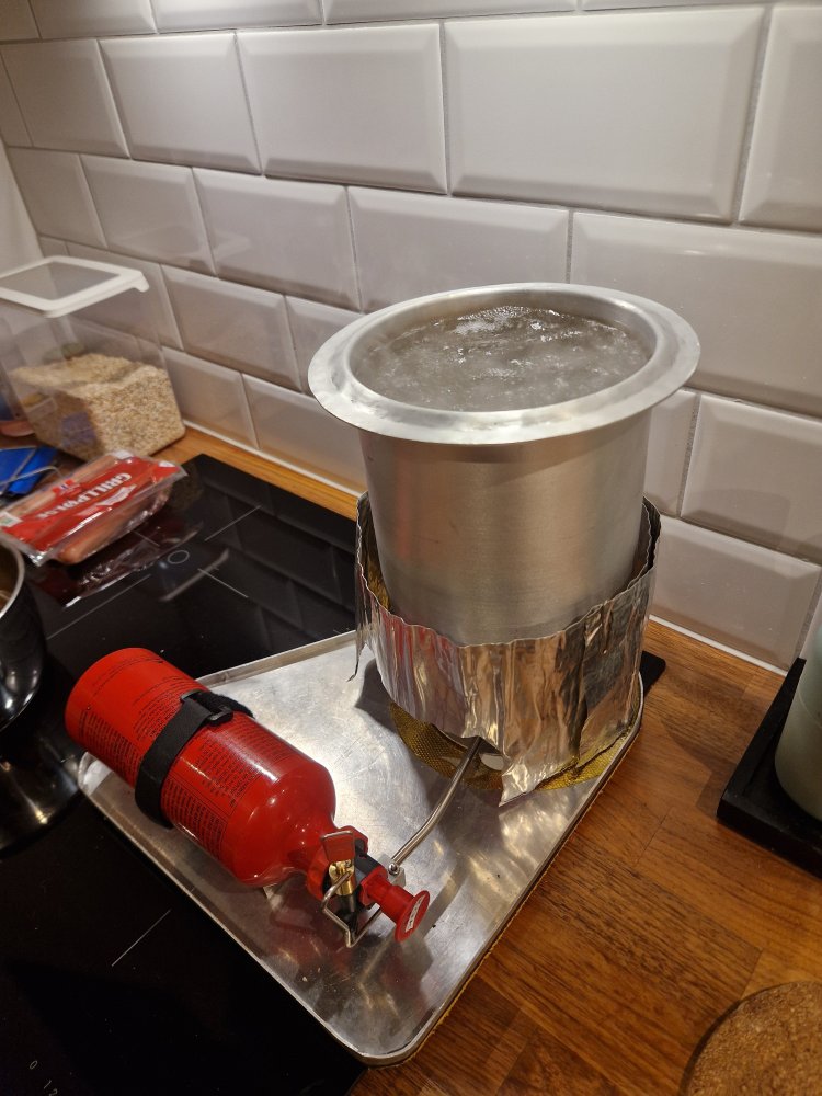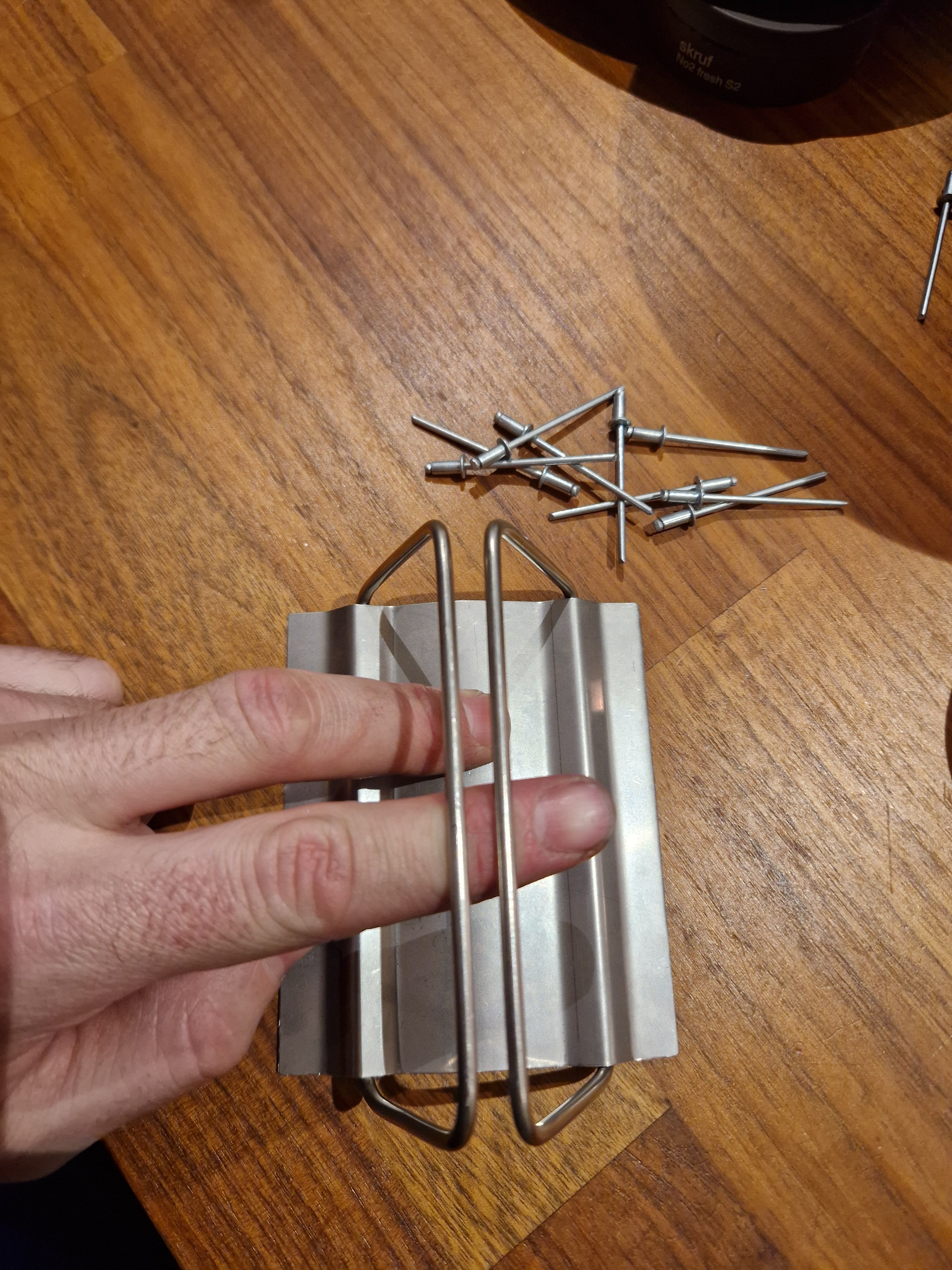 Fått laget en utgave av håndtakene og feste. Mangler å legge inn en liten bøy/knekk på håndtakene slik at de legger seg inntil kjelen når de er slått inn. Indre og yttre vindskjerm er tilpasset men ikke festet enda. Kjelen jeg har modifisert av et eldre bærspann har litt for mye godstykkelse. Skal se litt hva jeg finner på der, har to løsninger. Slipe den ned i godstykkelse i eller rett å slett få laget en ny i tynnere gods. Den drar opp vekten litt for mye, hadde jeg hatt en kjele mellom 200-250 gram hadde den komplette DIY kjelen vært i ca samme vekt som Ulrich sin.