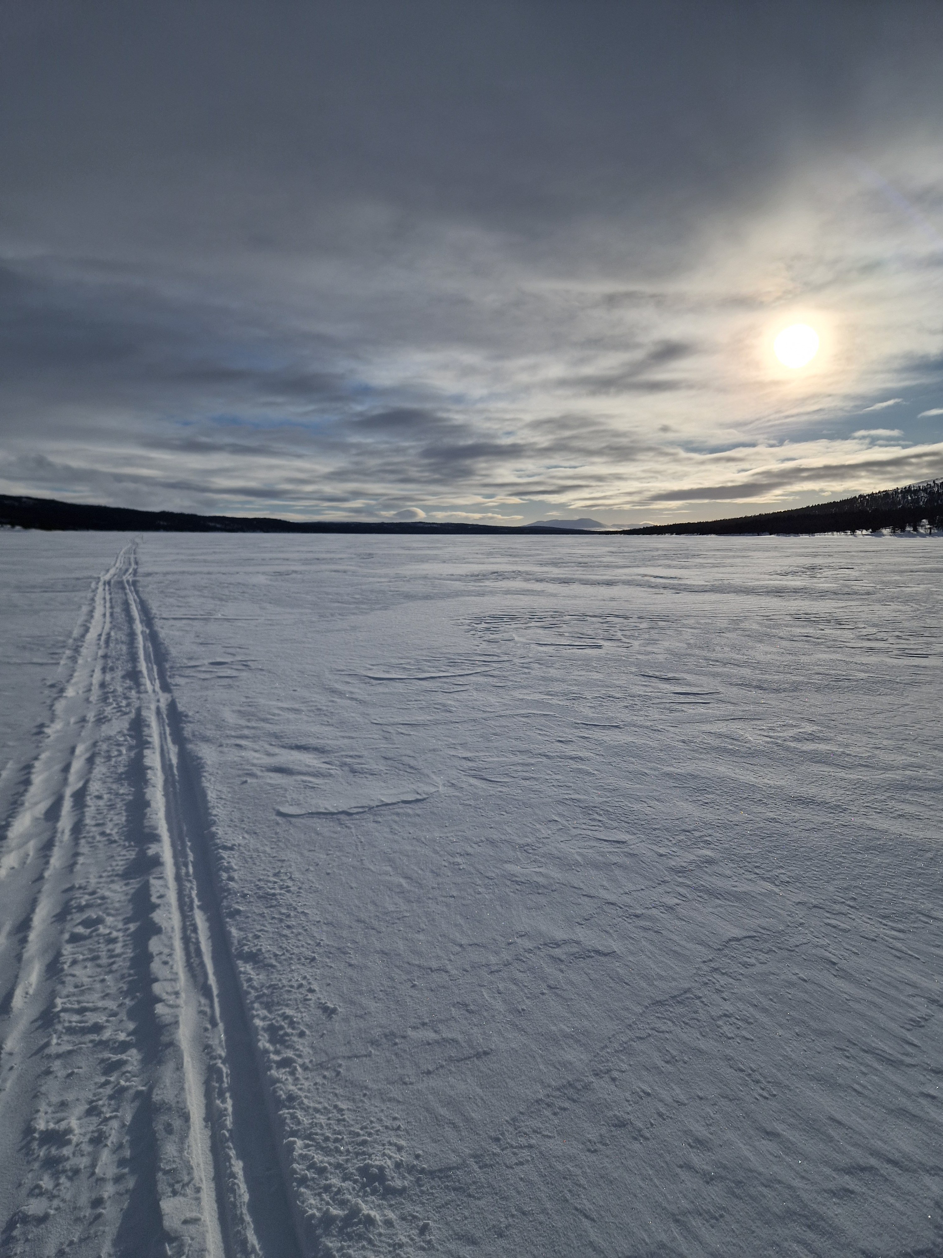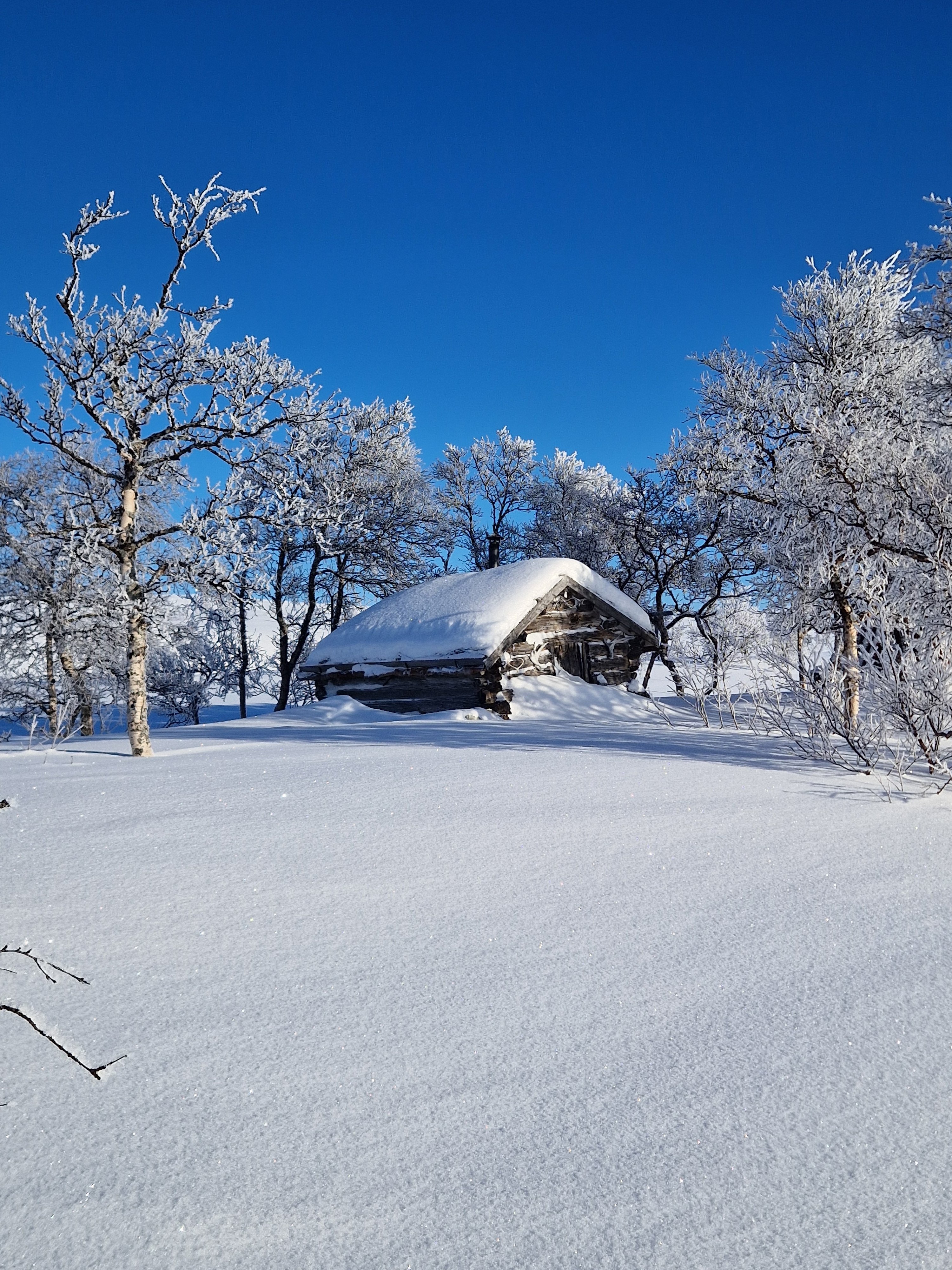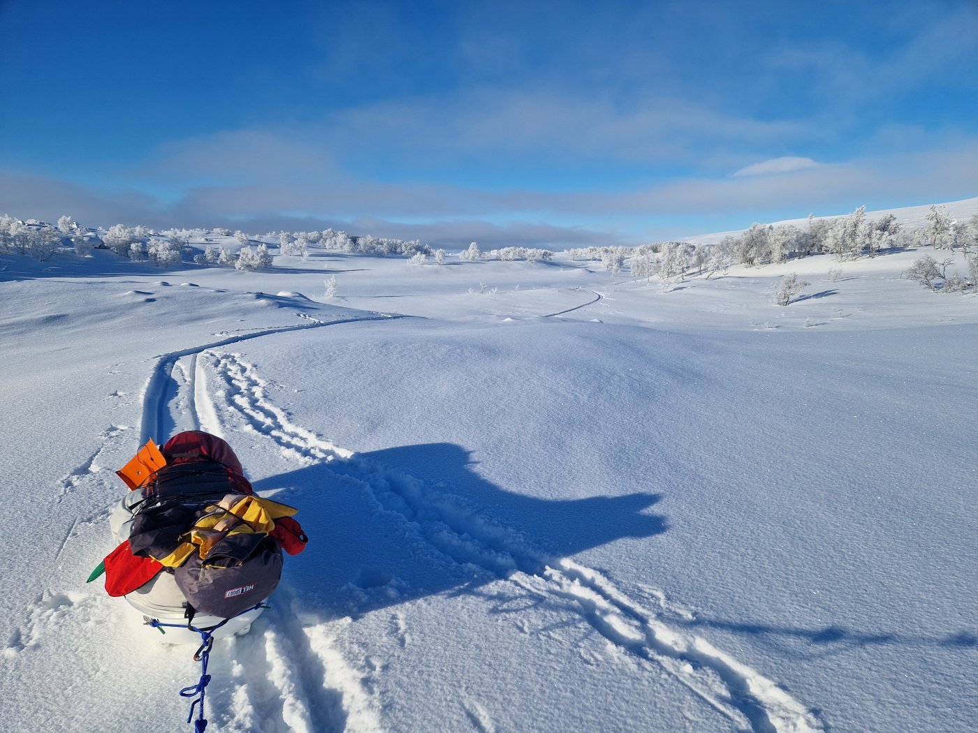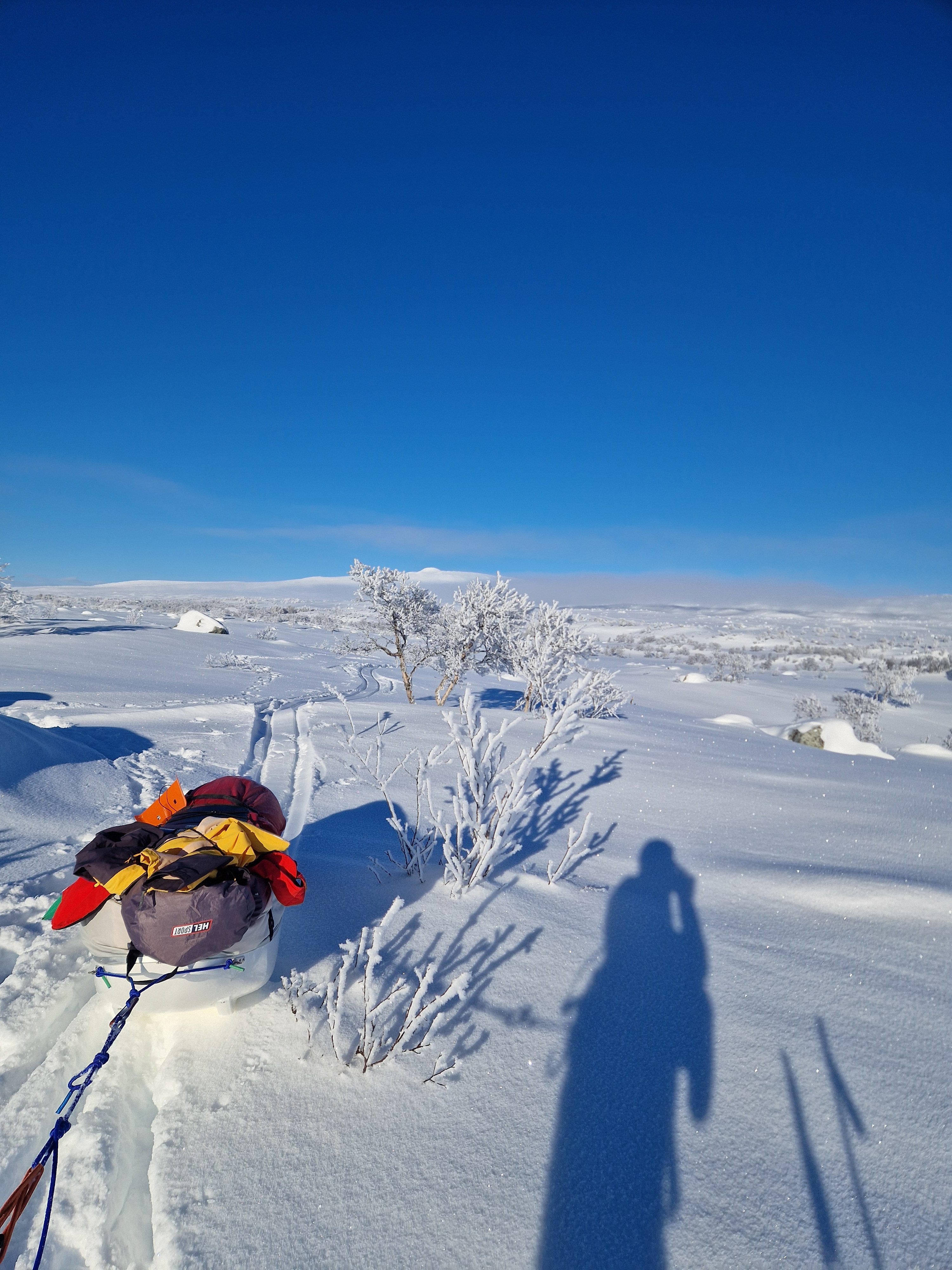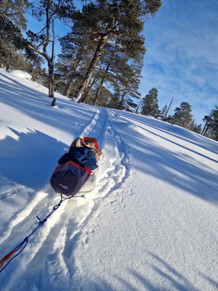 24. Tidlig februartur i Femundsmarka. Rute; Feragen - Ljøsnavollen - Nordre Håbu- Søndre Håbu - Nedre Muggsjøen/Muggsjølia - Grunnhåbua - Nordvika - Synnervika. Turen gikk så å si helt utenfor skuterspor utenom over Feragen og Femunden. Føret var relativt dårlig med lite hold I snøen og desverre en god del skare som tok knekken på hundelabene/beina. Første etappe over Feragen.Trivelig så lenge slengesporet varte. 3.5km til Ljøsnavollen...Da var det bare å legge på langfeller.Første natt i tregrensa ovenfor Ljøsnavollen og nedfor Storviglen. Første natt I nytt telt.Klargjøring til dagens strabasiøs. Polposer er bare genialt. Tror ikke det er mulig å få gnagsår med polposer.Pakke ned Camp.turkameraten klar for en ny dag.Føret er ingen høydare. Grått, løst og generelt bare tungt. Her er vi rett ovenfor tregrensa med viglene på siden av oss.Framme ved Nordre Håbu. Føret er tungt så etappene blir ikke så lange. Selen har vært teipet siden ny for å unngå at stroppene sklir. Måtte justere å teipe den opp på nytt.Fyr i ovnen å avslapping i Nordre Håbu.Været viser seg fra en bedre side. På vei mot Søndre Håbu.Storviglen titter opp av tåken.Søndre Håbu. Speider utover Nedre Muggsjøen. Flenskampen til høyre.Desverre er føret til hund relativt dårlig. Det ligger hele tiden en liten tynn skare i de øverste lagene av snøen. Dette sliter hardt oppover leggen på voffen.Solen er på vei ned å det samme er temperaturen. Har bare mobilkamera desverre. Vigelmassivet bader seg i dagens siste sol. Kveldens Camp. Så å si klar himmel, muligheter for alt mellom -20 og -30 denne natta. Ligger rundt 1.7km fra Muggsjølia.Snøsmelting på gangVindstille, -25, tørking av klær/hundeutstyr så blir det litt rim på ytterteltet.Teltsjefen. Koste seg gjennom natta med to nalgene-varmeflasker i posen. Desverre er tilstanden relativt dårlig på beina så ser ikke frem til denne dagen ute. Det er også kaldt.Rim er vakkert.Pakking av Camp. Vindstille og noe rundt -20.På vei nedover lia mot Grunnhåbua. Tungt føre..voffesen klarer til slutt ikke å holde følge. Han svømmer konstant.Grunnhåbua. Å komme seg hit har kostet opp til flere mini-twix, mars og milkway 😅Inspiserer beina på Faun, han har begynte å blø samt mangler veldig mye pels. Det er ganske kaldt å jeg blir bekymret for frostskader. Stapper han nedi jervehiet og pulken. På dette tidspunktet er pulken tung og føret håpløst. De siste kilometerne ned til Nordvika blir en strabasiøs tur. Brunskinnet veier rundt 27kg 😅Siste dagen ble en lang og slitsom. Men jeg ville ikke slå opp Camp for å ha enda en dag til med kaving i snøen samt en hund med dårlige bein. Her er det straka veien til Synnervika. Val