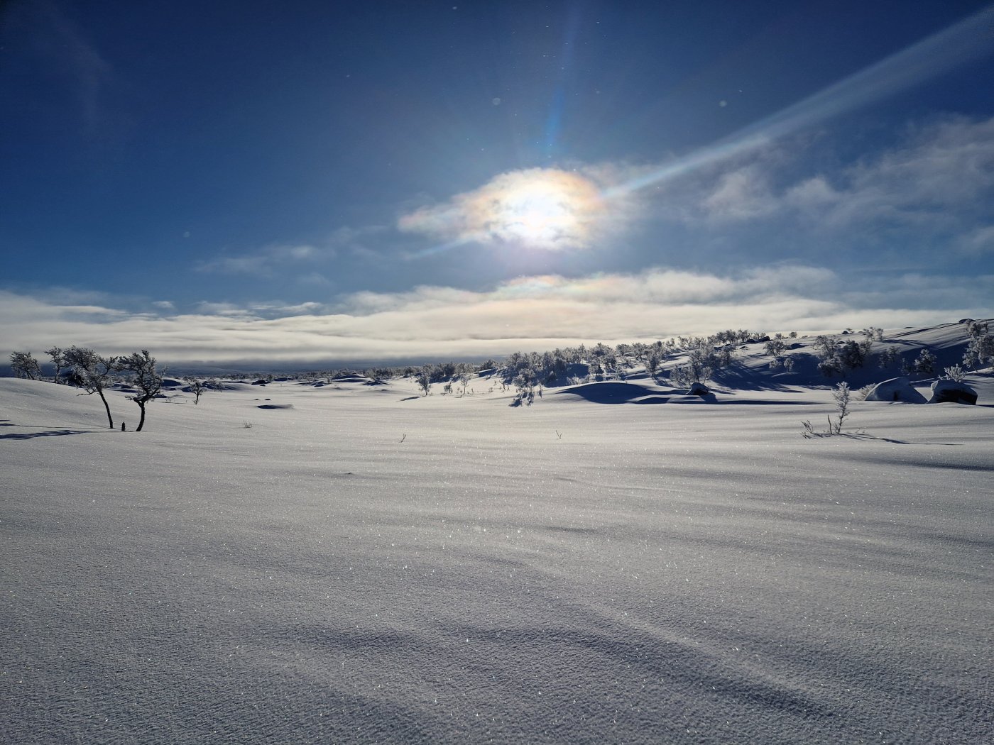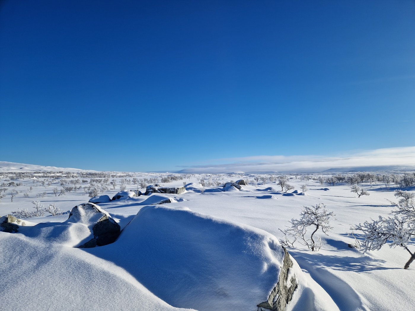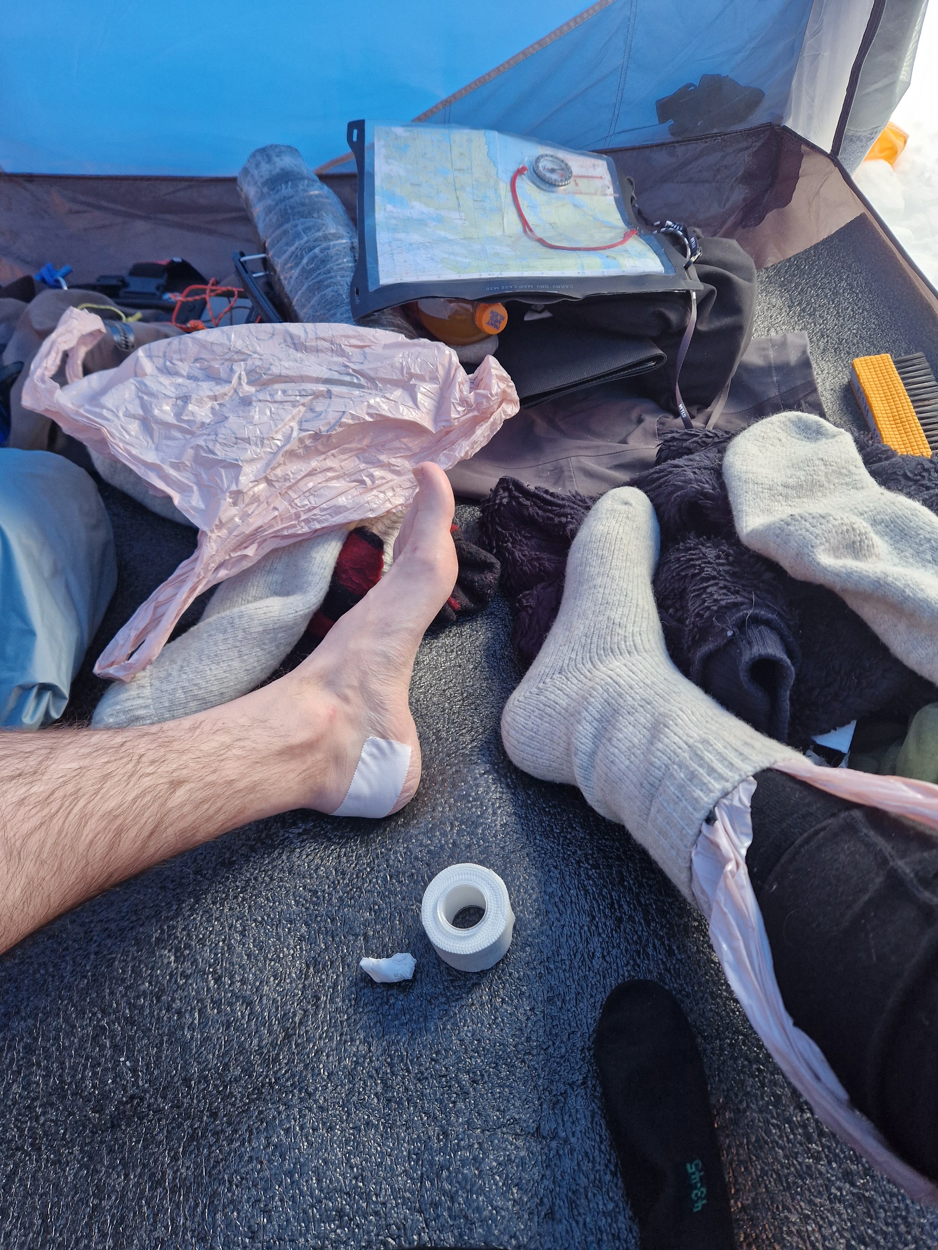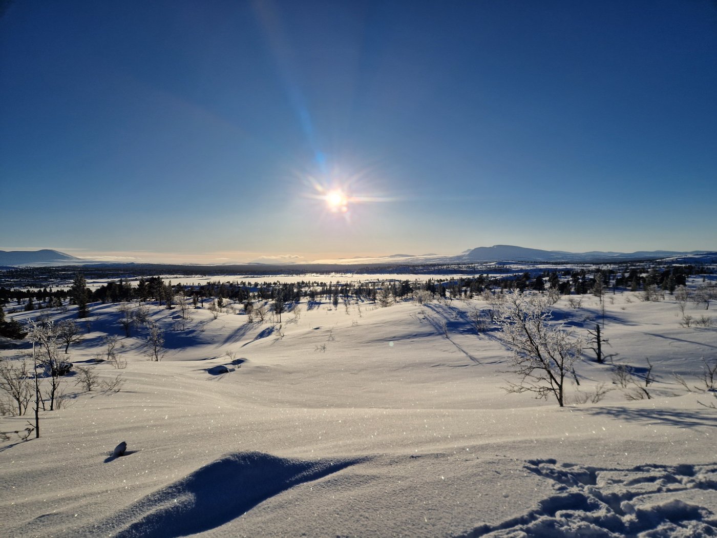 24. Tidlig februartur i Femundsmarka. Rute; Feragen - Ljøsnavollen - Nordre Håbu- Søndre Håbu - Nedre Muggsjøen/Muggsjølia - Grunnhåbua - Nordvika - Synnervika. Turen gikk så å si helt utenfor skuterspor utenom over Feragen og Femunden. Føret var relativt dårlig med lite hold I snøen og desverre en god del skare som tok knekken på hundelabene/beina. Første etappe over Feragen.Trivelig så lenge slengesporet varte. 3.5km til Ljøsnavollen...Da var det bare å legge på langfeller.Første natt i tregrensa ovenfor Ljøsnavollen og nedfor Storviglen. Første natt I nytt telt.Klargjøring til dagens strabasiøs. Polposer er bare genialt. Tror ikke det er mulig å få gnagsår med polposer.Pakke ned Camp.turkameraten klar for en ny dag.Føret er ingen høydare. Grått, løst og generelt bare tungt. Her er vi rett ovenfor tregrensa med viglene på siden av oss.Framme ved Nordre Håbu. Føret er tungt så etappene blir ikke så lange. Selen har vært teipet siden ny for å unngå at stroppene sklir. Måtte justere å teipe den opp på nytt.Fyr i ovnen å avslapping i Nordre Håbu.Været viser seg fra en bedre side. På vei mot Søndre Håbu.Storviglen titter opp av tåken.Søndre Håbu. Speider utover Nedre Muggsjøen. Flenskampen til høyre.Desverre er føret til hund relativt dårlig. Det ligger hele tiden en liten tynn skare i de øverste lagene av snøen. Dette sliter hardt oppover leggen på voffen.Solen er på vei ned å det samme er temperaturen. Har bare mobilkamera desverre. Vigelmassivet bader seg i dagens siste sol. Kveldens Camp. Så å si klar himmel, muligheter for alt mellom -20 og -30 denne natta. Ligger rundt 1.7km fra Muggsjølia.Snøsmelting på gangVindstille, -25, tørking av klær/hundeutstyr så blir det litt rim på ytterteltet.Teltsjefen. Koste seg gjennom natta med to nalgene-varmeflasker i posen. Desverre er tilstanden relativt dårlig på beina så ser ikke frem til denne dagen ute. Det er også kaldt.Rim er vakkert.Pakking av Camp. Vindstille og noe rundt -20.På vei nedover lia mot Grunnhåbua. Tungt føre..voffesen klarer til slutt ikke å holde følge. Han svømmer konstant.Grunnhåbua. Å komme seg hit har kostet opp til flere mini-twix, mars og milkway 😅Inspiserer beina på Faun, han har begynte å blø samt mangler veldig mye pels. Det er ganske kaldt å jeg blir bekymret for frostskader. Stapper han nedi jervehiet og pulken. På dette tidspunktet er pulken tung og føret håpløst. De siste kilometerne ned til Nordvika blir en strabasiøs tur. Brunskinnet veier rundt 27kg 😅Siste dagen ble en lang og slitsom. Men jeg ville ikke slå opp Camp for å ha enda en dag til med kaving i snøen samt en hund med dårlige bein. Her er det straka veien til Synnervika. Val