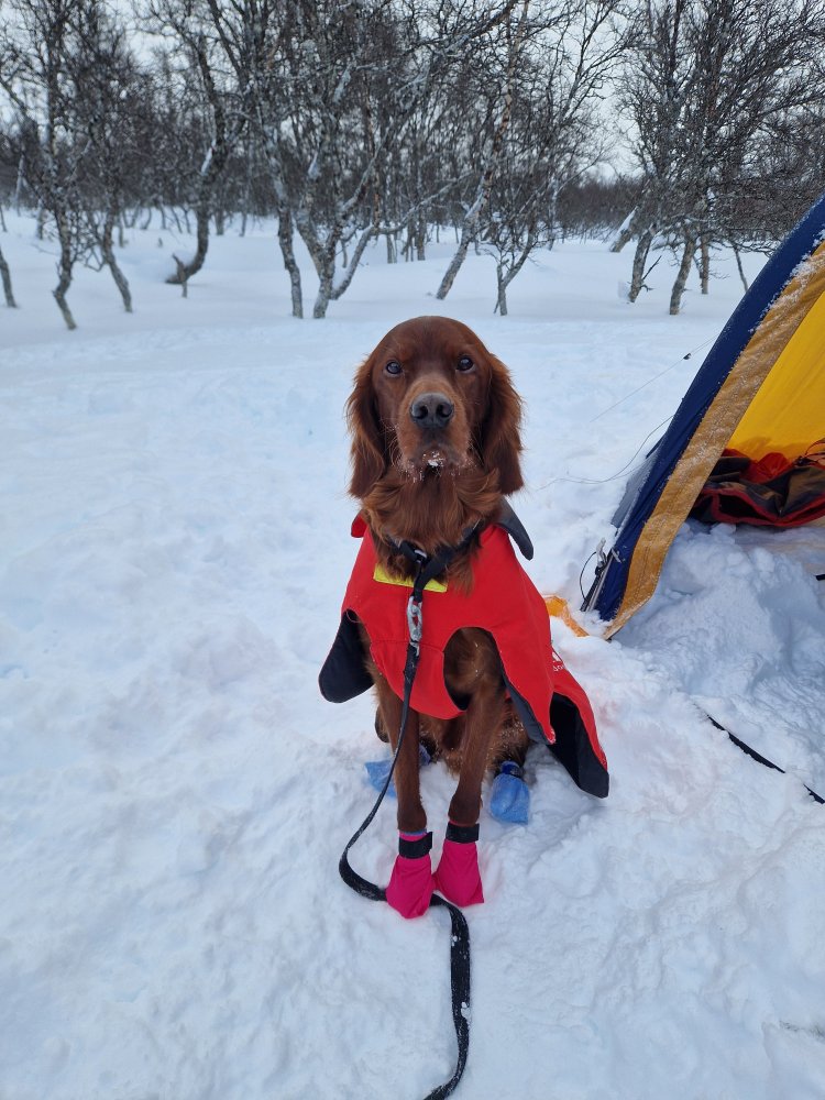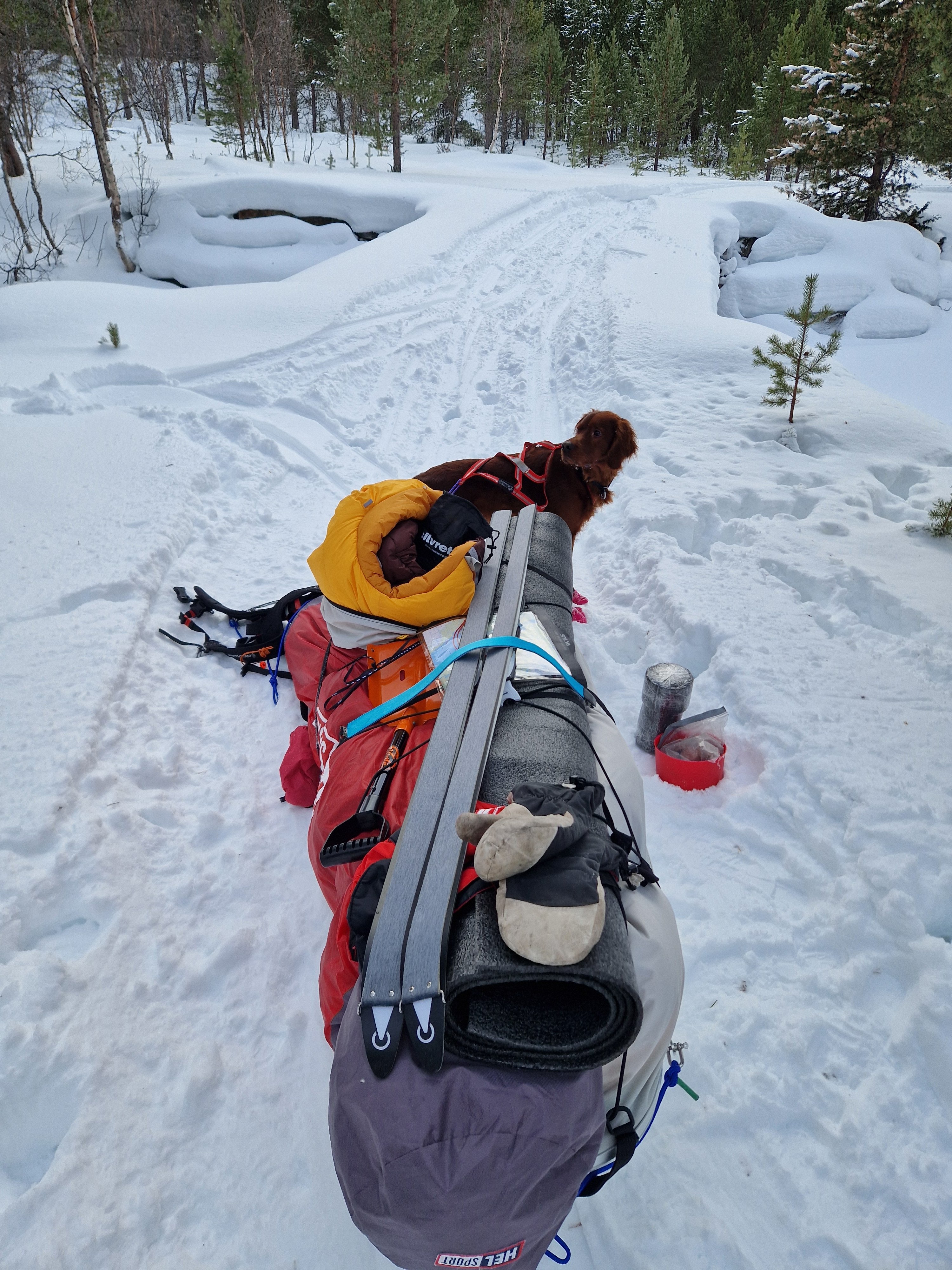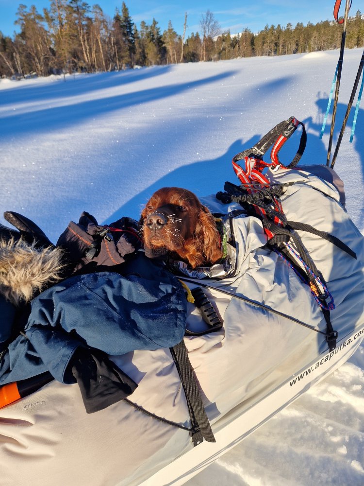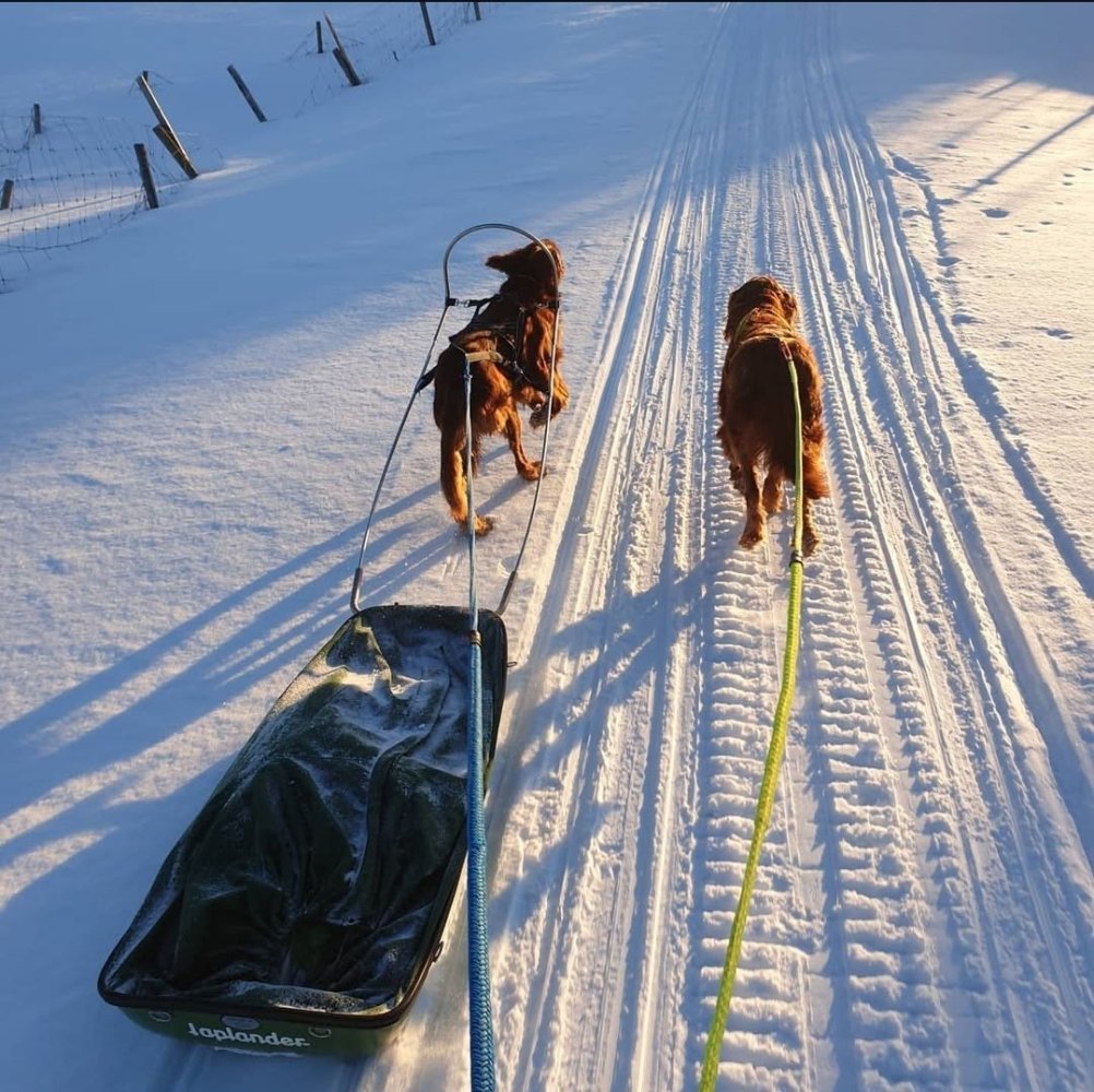 6. Tilvenning av pulk vil variere litt fra hund til hund og hva de liker å ikke liker. Skal man bruke drag så må du ha et hundedrag og en kombi/pulksele som har 4 fester på siden. Nome forspenning er også et alternativ og da står du tilkoblet bak pulken men ville nok ikke startet med dette. Seletøy for hund er som når du kjøper sko til beina dine, riktig passform og størrelse er viktig for hunden. Feil størrelse gir feil belastning, strøper hunden i hals feks. Så dette er noe jeg anbefaler kun å kjøpe i butikk der personal har peiling å kan finne en sele som passer akkurat din hund. Jeg vet ikke hvor mange hunder jeg passerer i skiløypa ila et år som høres ut som de skal bikke om i neste sving fordi selen strøper de. Men selen var vel kul å godt eksponert i sosiale medier 😅 Jeg liker best å snørekjøre hunden, da deler vi på jobben. Jeg får god hjelp foran og sliter ikke like mye på hunden. Tom pulk på feks hardt føre og is lager vannvittig mye lyd, dette kan være veldig skremmende for en hund som ikke er vandt til det. Så velg forhold der ikke pulken skaper så mye lyd i starten Her er yngstemann med Troll kombi sele og Segebaden hundedrag. Hadde ikke sluppet avgårde en uerfaren hund med pulken uten at den var tilkoblet meg. Skulle hunden bli skremt å den drar avgårde så kan man med helt sikkert si at den hunden ikke har lyst å trekke noe mer pulk
