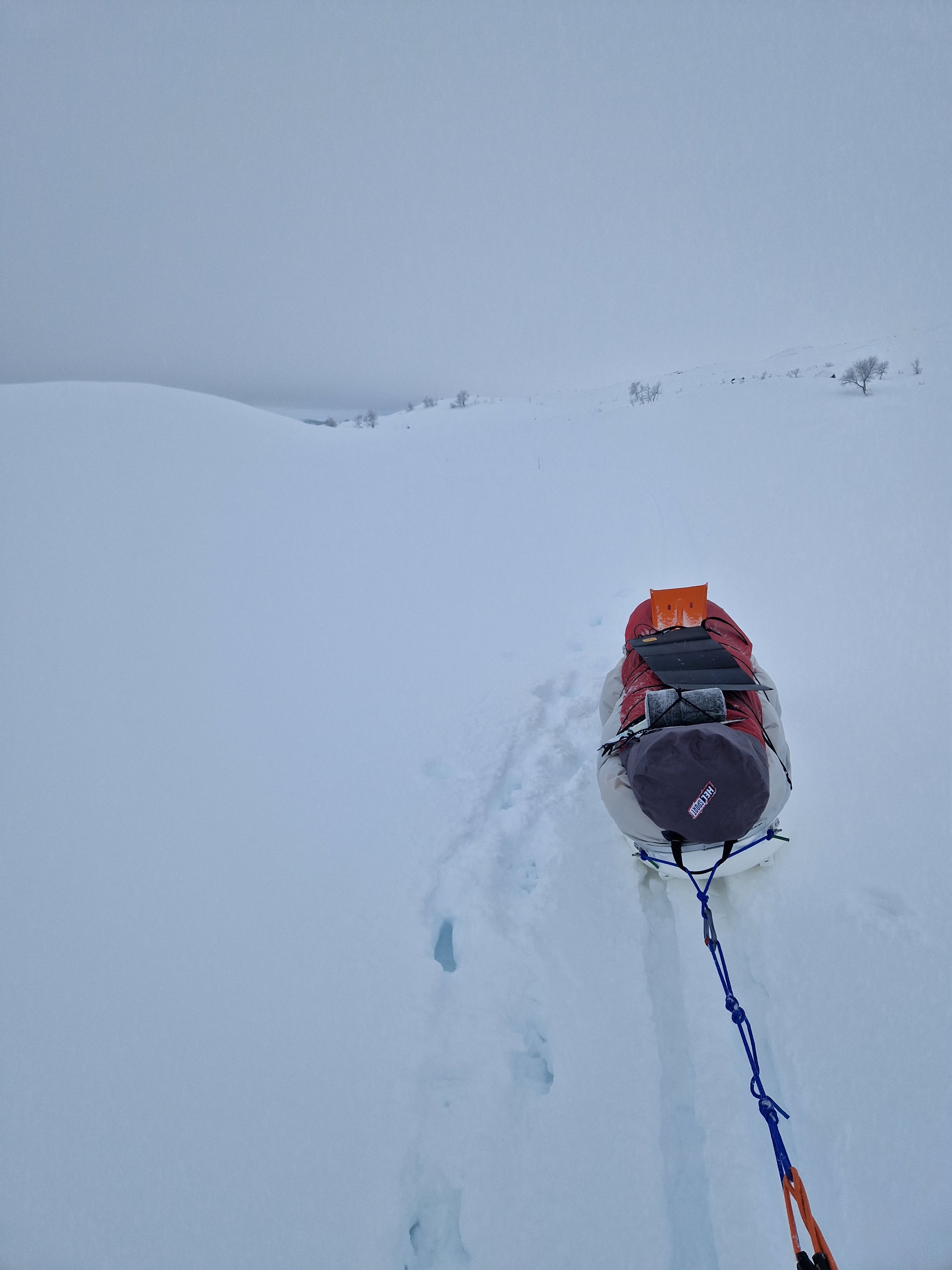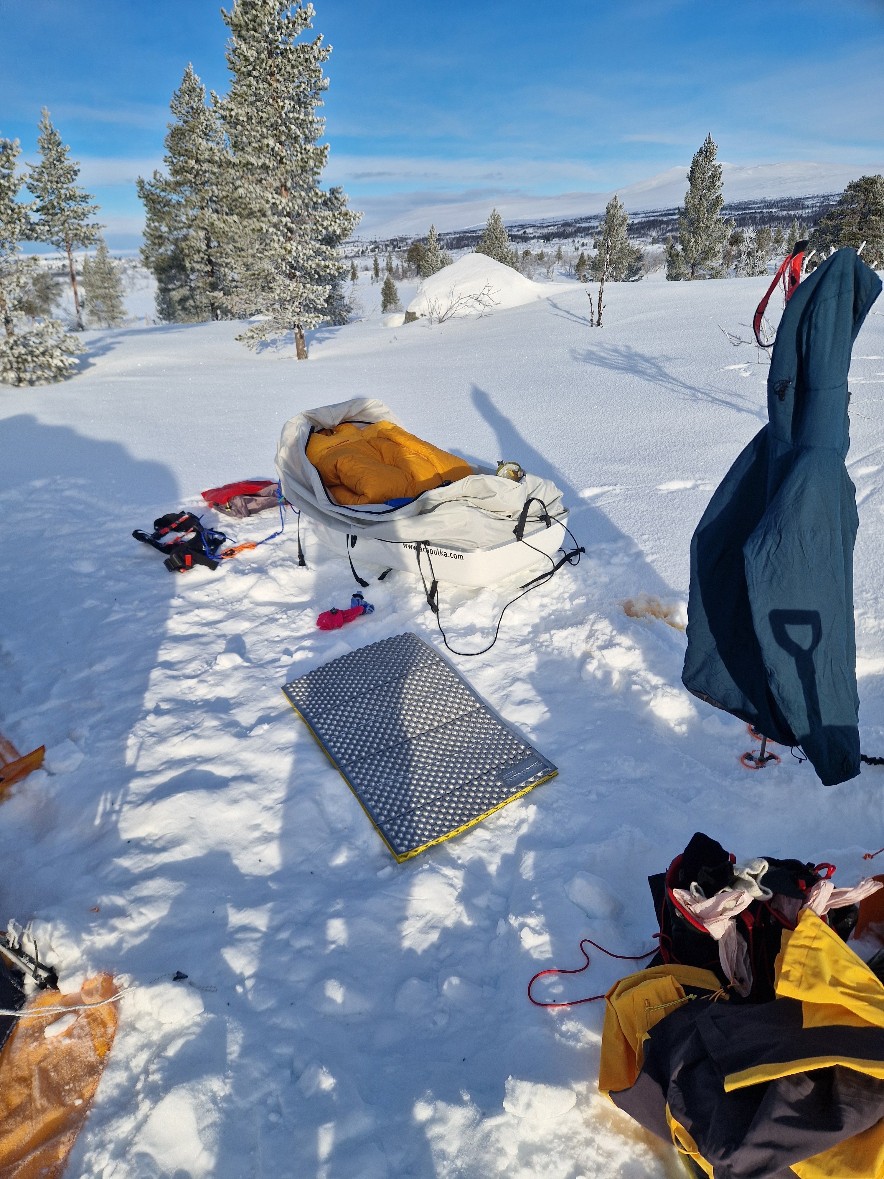 11. Jeg brukte bedding når jeg hadde en mindre pulk enn den jeg har idag. Det skapte mer plass i pulken. Men om guttungen er med på tur bruker jeg beddingen da det er plass til sovepose og underlag til to. Solotur legger jeg bare posen med underlaget øverst i pulken. Har teltpose og spade på toppen av pulken.