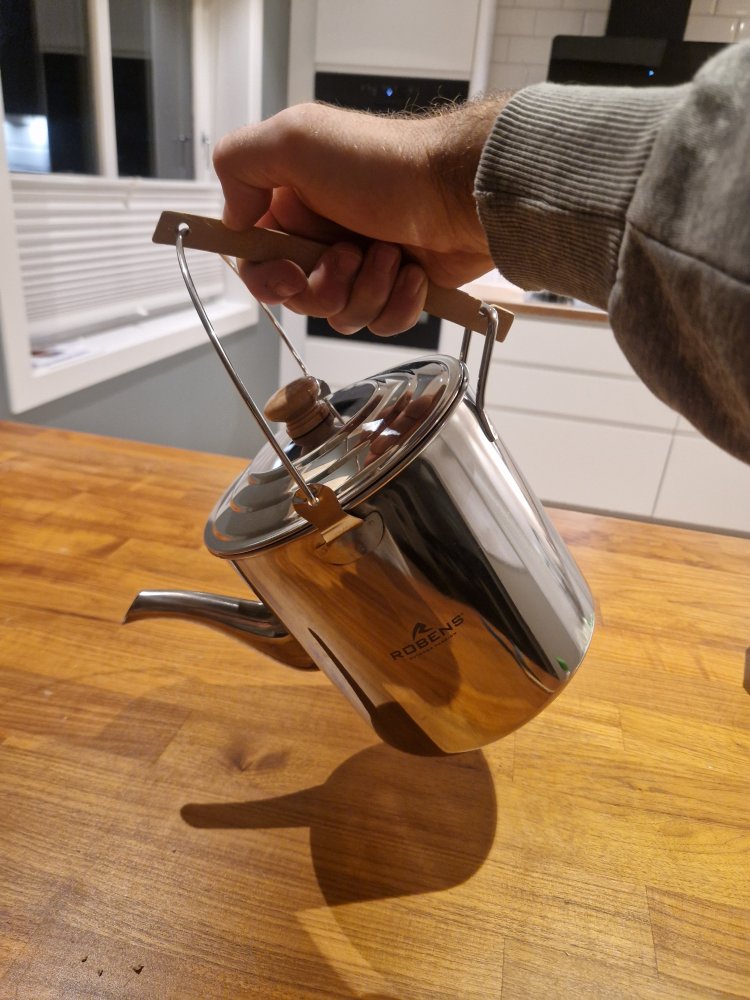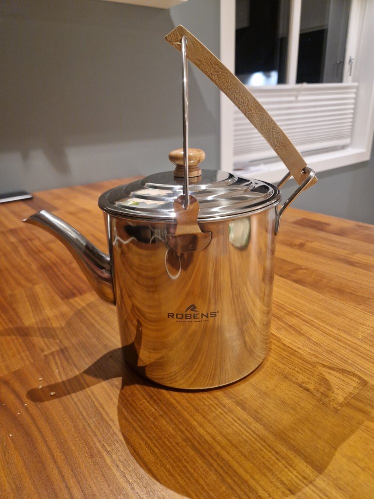 19. Har drevet å kikket etter en Teapot Billly laget i aluminium, men disse ser ut til å bare selges i Australia. Frakten blir relativt stiv for en liten kjele om den skal kjøpes derifra. De som selges på ebay er også fra nedunder😅 Siden kjelen har tut tror jeg det vil redusere noe kondens da en slipper å ta av lokket for å helle vannet over i termos eller lignende. Denne er å få kjøpt i Norge men er lage av rustfritt stål, så den er vel ca 50% tyngre enn en billy teapot laget i alu. Robens White River Kettle 3L Silver. Mulig man får ta til takke med de ekstra gammene, skal jo uansett trekkes i pulk.