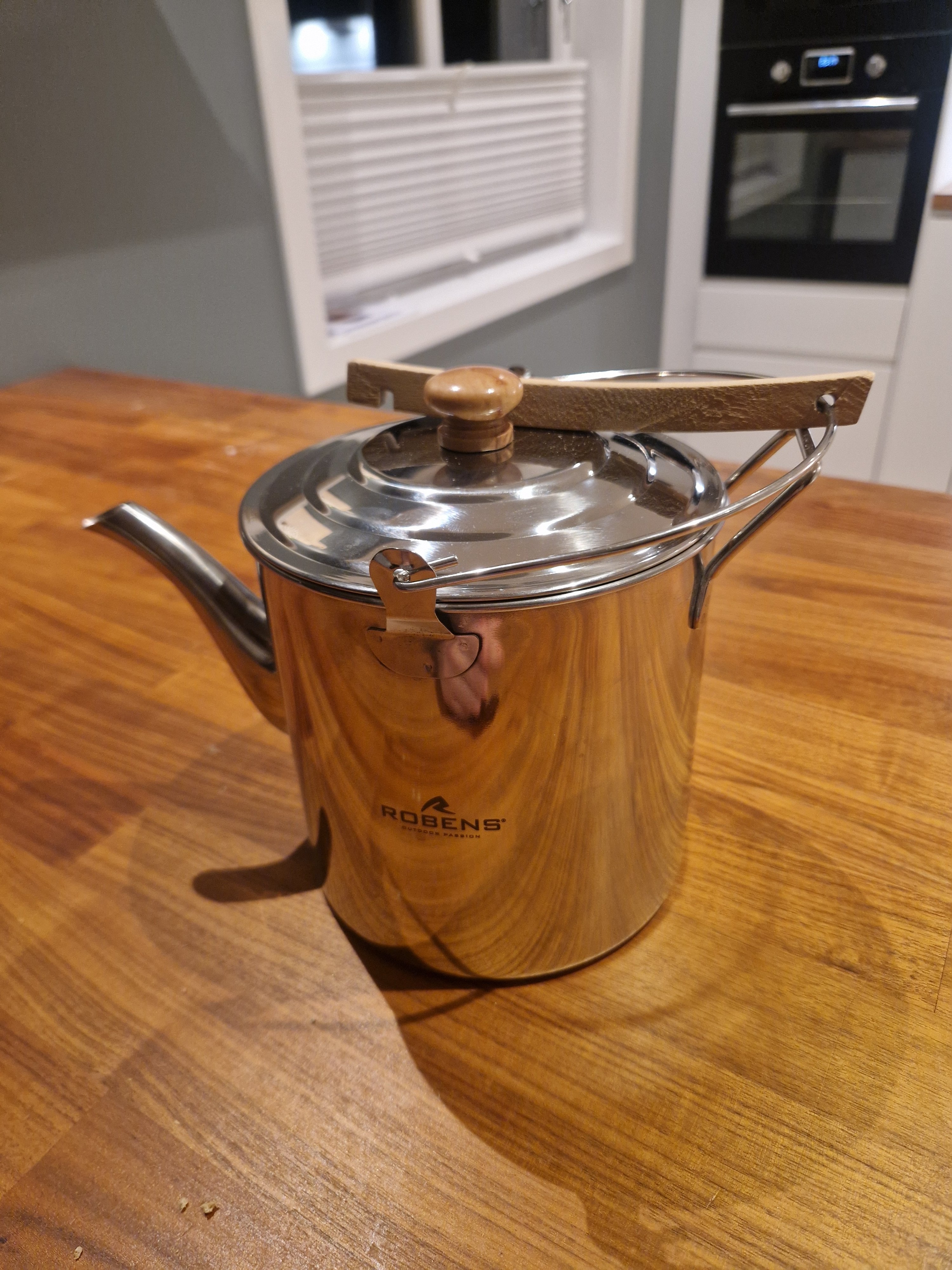 16. Takk for flere gode forslag! Syns kjeler med rundt 3L kapasitet er fine for å smelte snø. Bestilte en 3L teapot billy fra Robens i rustrittstål. Litt tyngre enn de i aluminium men ikke noe avskrekkende vekt sånn sett. Med litt inspirasjon fra Eric Phillps så ser kjelen ut til å fungere utmerket til formålet. Håndtaket laget av en gammel kleshenger som ser ut til å være eik.