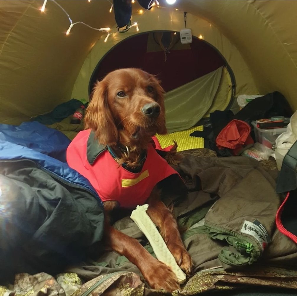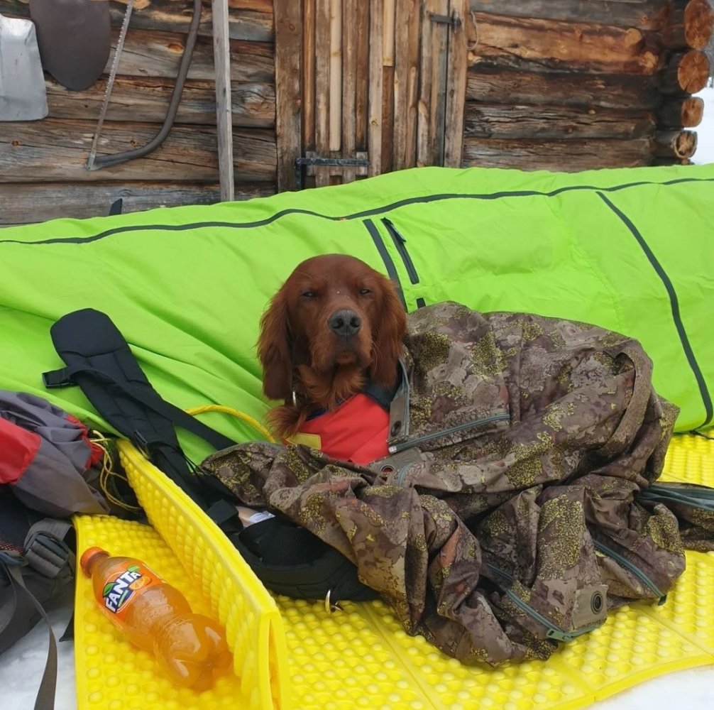 Hvileposen til magasinet ser ikke ut til å være foret men har isolert bunn. Dvs et tynt celleplast underlag i bunnen av posen. Mine irsksettere har brukt jervehiet i alle år. Et super produkt som jeg bruker hele året egentlig. Jervehiet kommer i to deler, yttertrekket og innerpose(primaloft). Disse må kjøpes hver for seg. Siden ytterpose og innerpose er to deler er det veldig lett å tørke eller vaske. Foret knytes enkelt fast i yttertrekket ( det er 4 festepunkter i yttertrekket) Jervehiet er sovepose og hundeseng på tur. Hunden finner alltid roen og vet hvor plassen hans er i teltet. Bruker hiet/duk når vi er på jakt også, alltid ro og restitusjon i pausene. Min irsk er med på de aller fleste vinterturene jeg er på med ski og pulk. Hvilepose/fjellduk har jeg alltid tilgjengelig for han i pauser, ved oppsett av telt/Camp eller ved riving av telt/nedpakking. Da slipper han å stå der å bli kald når været er ruskete. Fuglehunder er ikke polarhunder, men tåler alltids dårlig vær og kuldegrader så lenge man tar noen forhåndsregler. På en valp er det enda viktigere da de ikke har fått like god pels som en voksen hund. Har du fjellduk fra før av kan den brukes sammen med en innerposen til jervehiet. Da sparer man både volum og litt vekt