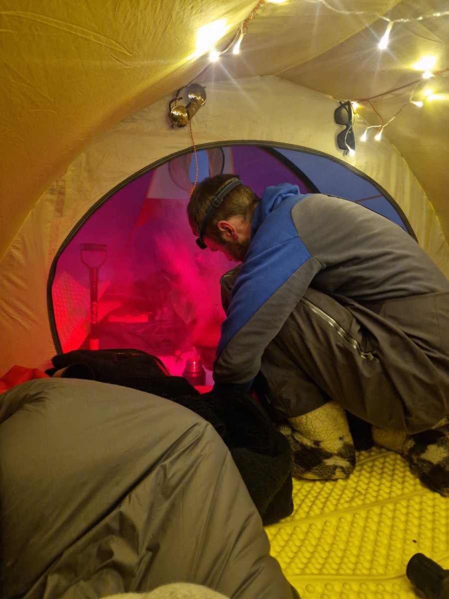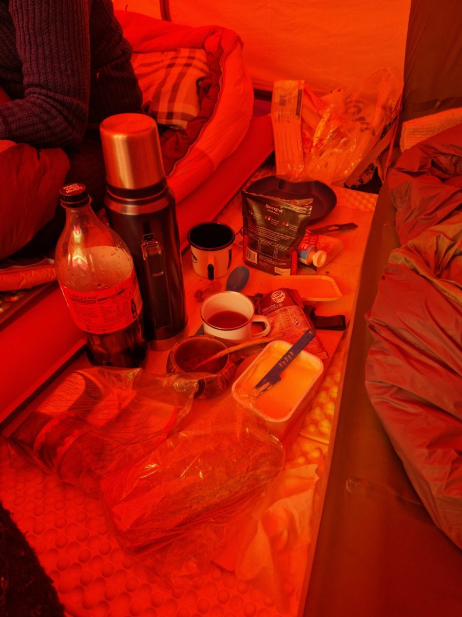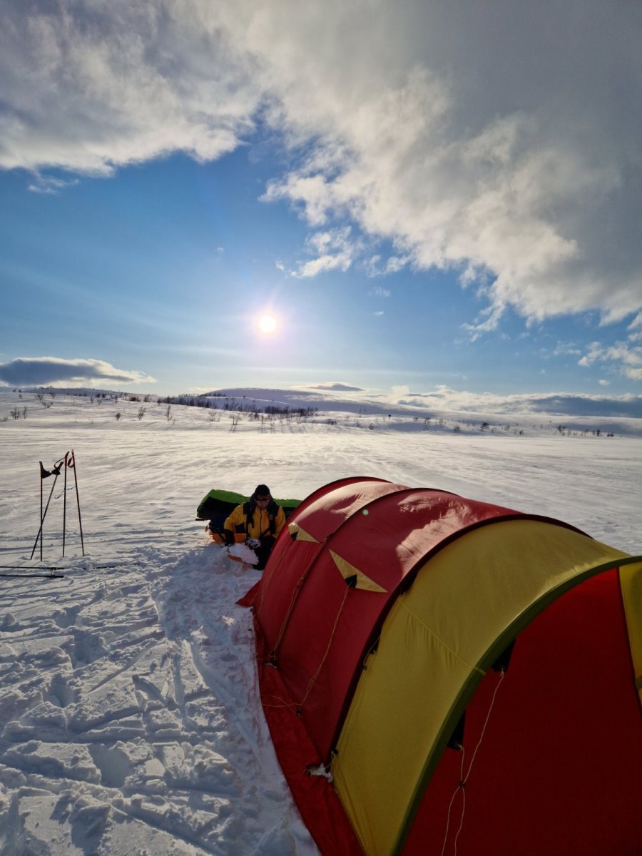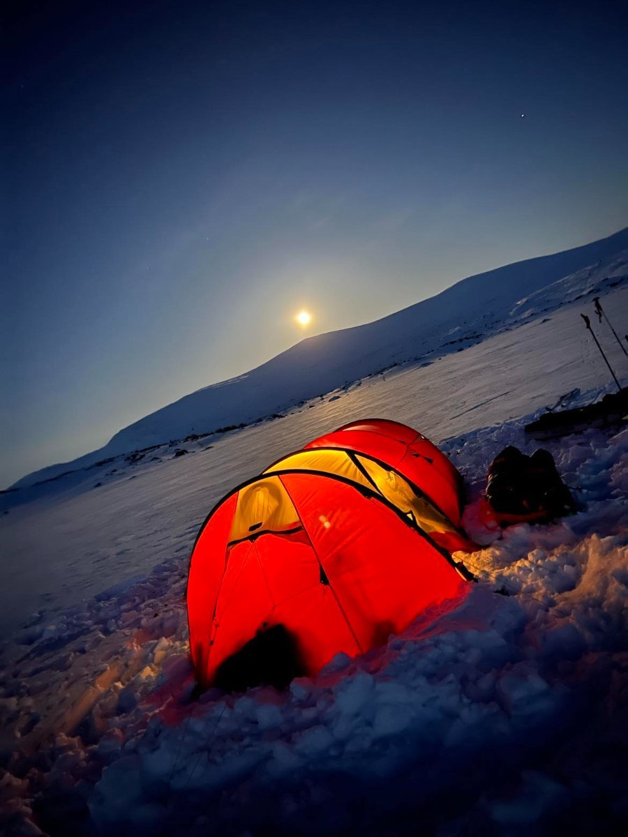 Lurte samboer med på telttur. Kort tur der comfort sto i fokus, nå har hu vært med sommer og høst men ikke vinterstid. Meget fornøyd med å lurt henne med på dette 😂Telt slåes opp, var litt snøfokk å guffent en vending. Ble vindstille til natten.Kjøkkentjeneste, steker bacon til hamburger.Kokken i aksjon,fruen har pyntet med insta-vennlige lys.Litt kos må man unne seg.Glemte selvsagt korktrekkeren, gamle tjuvtriks kommer godt med.Her fylles Nalgene-varmeflasker for harde livet. Å fryse på første vintertur var ikke aktuelt😅Frokost på liggeunderlaget.Peldyret Faun tar seg en hvil mens pulker pakkes å camp rives.Snø fjernes av elefantørene.