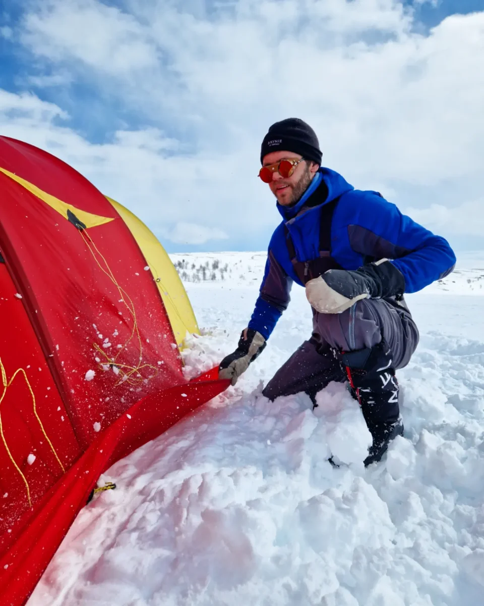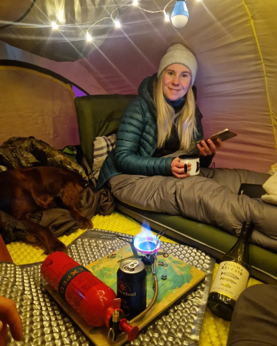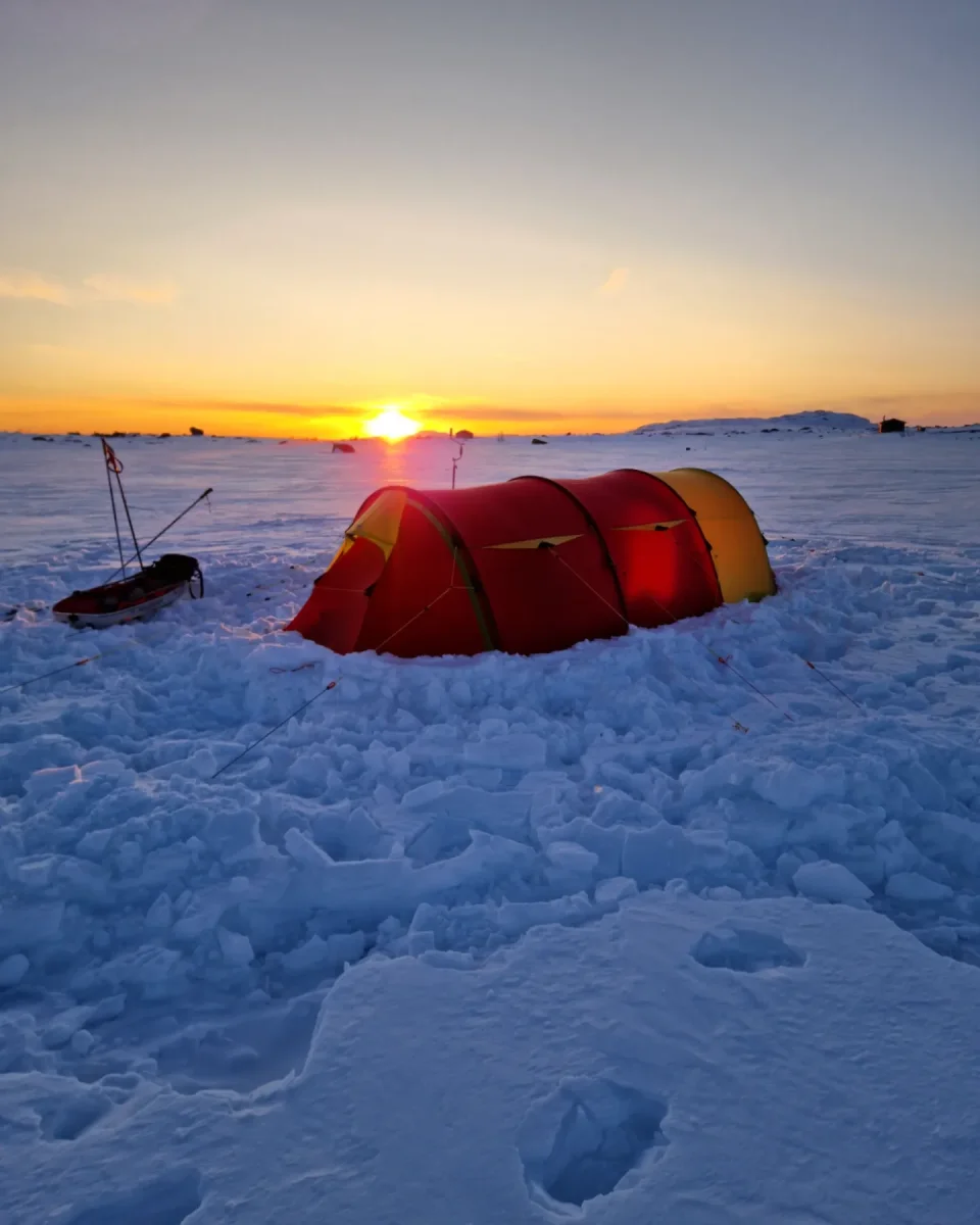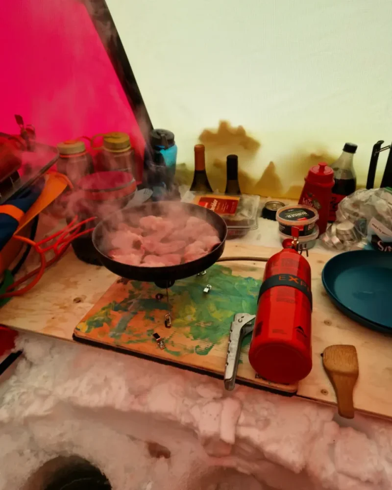 Lurte samboer med på telttur. Kort tur der comfort sto i fokus, nå har hu vært med sommer og høst men ikke vinterstid. Meget fornøyd med å lurt henne med på dette 😂Telt slåes opp, var litt snøfokk å guffent en vending. Ble vindstille til natten.Kjøkkentjeneste, steker bacon til hamburger.Kokken i aksjon,fruen har pyntet med insta-vennlige lys.Litt kos må man unne seg.Glemte selvsagt korktrekkeren, gamle tjuvtriks kommer godt med.Her fylles Nalgene-varmeflasker for harde livet. Å fryse på første vintertur var ikke aktuelt😅Frokost på liggeunderlaget.Peldyret Faun tar seg en hvil mens pulker pakkes å camp rives.Snø fjernes av elefantørene.