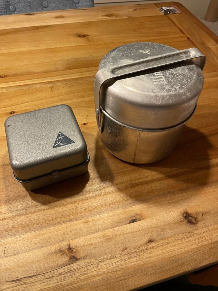 @Dompappen Hvis du kjøper et billig stormkjøkken-sett, og sjekker at de to grytene kan settes kant mot kant med det ene som lokk, så er det en god, lett og rimelig løsning. Lag en hank/håndtak som kan foldes på den minste, som blir lokket, og vipps: Du har en gryte som kan fylles med dobbelt så mye snø som selve gryta tar, samtidig som det smeltes under lokk for mindre forbruk av fuel. Da slipper du også å fylle på snø hele tiden. Hvis du i tillegg modifiserer vindskjermen på stormkjøkkenet så den passer over/oppå den primusen du bruker, så har du et kompakt og lett oppsett, der alle delene kan stables inni hverandre, og en rigg som er en ekstremt godt isolert og effektiv snøsmelter. Her er min, i bruk på tur forrige uke: og her, litt bedre illustrert med et bilde innendørs i god belysning: