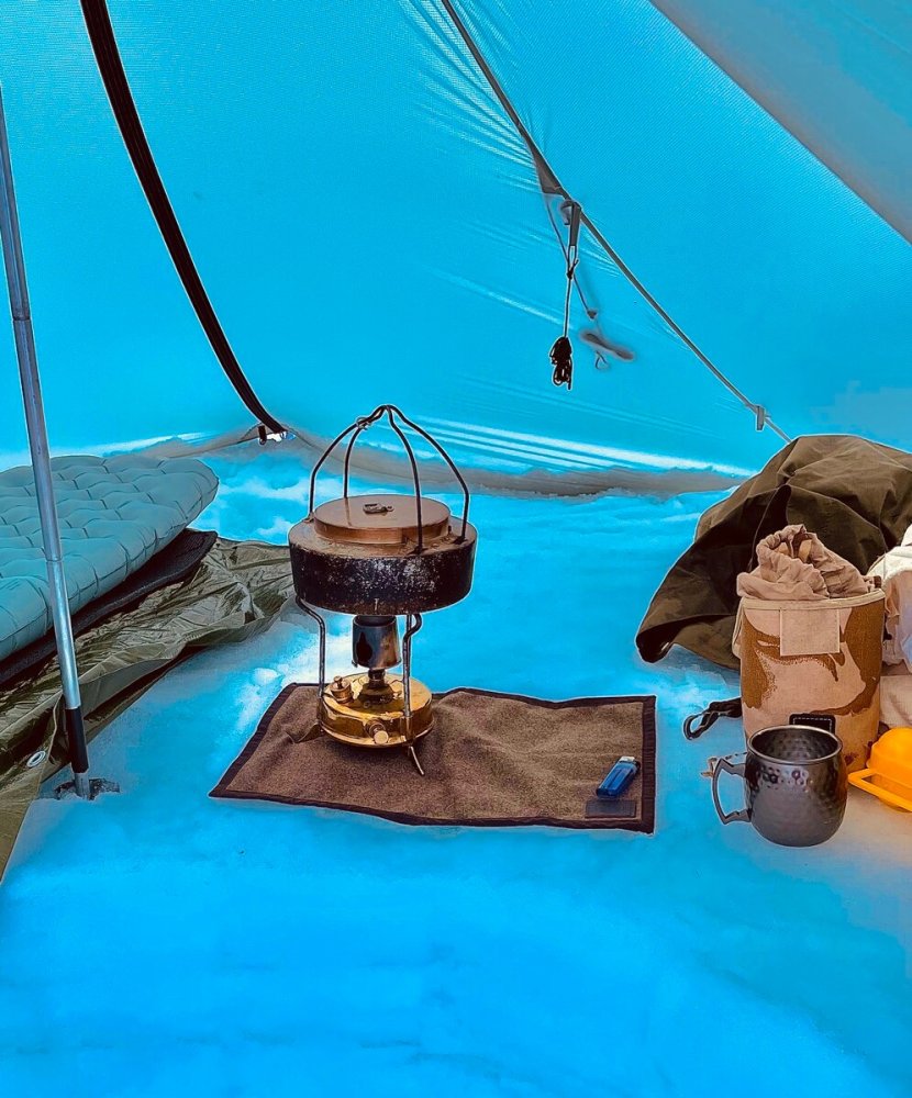 Vel, det er nokså gjennomtenkt i design og funksjon, men så veldig high-tech kan jeg ikke påstå at det er, ettersom det i bunn står en forniklet messing-primus fra 1936 😁 De største fordelene er at man kan fylle kjelen 200% med snø men samtidig ha tett lokk, man får en kjele som huser veldig mye snø ifht pakkstørrelse og vekt, og innbygningen gjør at man taper minimalt med varme (og fuel) til omgivelsene. Pakket ned, med primus inni (både brennerhode og 0.5L tank), verktøy, stativ/vindskjermer, to kjeler og stekepanne, så er ikke snøsmelter-pakka større enn dette: