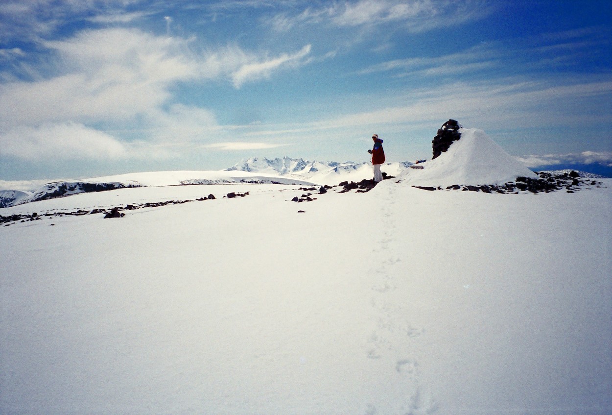 20. Legger ved et bilde fra toppen av Loftet, tatt 16.06.1996. Det blir riktignok på ”motsatt” tid av året i forhold til når du skal dit ”Poppe”, men du ser litt hvordan snøen ligger på det svære topplatået. Mest snø lå det ut mot øst, mot Leirdalen. Vinteren 1995/1996 var snøfattig i Jotunheimen, og vi kunne ta fotturer i høyfjellet tidlig den sommeren. Du ser også at det ”Mayhassen” sier om Veslfjelltinden, bekreftes på bildet. Virker å være hakket mer snø/fonner på den toppen (bak til venstre).