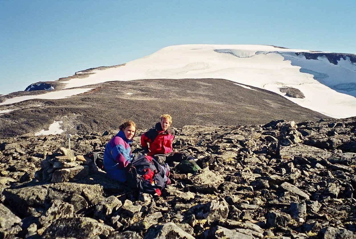 Tja, den korteste veien fra store Memurutind til Glitterheim uten brepassering, må bli å ta seg opp mot Leirhø (2330). Fra Leirhø tar dere ned nordvestryggen, og når dere er på høyde med foten av breen på nordsiden av Leirhø ( omtrent her ), går dere nordover retning Spiterhø (2033). Rett før Spiterhø dreier dere NØ og ned i dalen øst for Spiterhø. Dette bringer dere trygt ned på Skautflye og strake veien til Glitterheim. Alternativt kan dere, fra toppen av Leirhø, gå rett nordover og følge høyre kant av breen langs øststupet (ikke FOR langt mot øst ). I månedskiftet juni/juli bør det ikke være behov for stegjern der. Vi gikk opp der 4. september 1999, og da var breen hard, men vi kom allikevel opp uten stegjern ved å kante skoene i den bratteste delen. Vel, bratt blir jo feil ord. Kanskje viktigst: Vi så ingen tegn til sprekker der da, lengst øst på den breen. Og vi gikk der altså på høsten (se vedlagte bilde). Men, det er jo noen år siden, og selvfølgelig, breer ligger som regel ikke helt i ro. Føler dere at litt brepassering er OK, og vil ta den mest usikre ruta, er jo det korteste alternativet å gå ned mot Leirhø Sør (2110) og følge den lange moreneryggen som strekker seg helt til topp 1886. Har lurt litt selv faktisk, på om det er mulig å ta seg ned øst for denne toppen. Ser bratt ut, og ikke minst, et vann sperrer veien nedenfor med brearmer ut på hver side. Kanskje er det mulig å liste seg på trygg grunn på en av sidene?? Ser ikke ut som det er brefri passasje på noen av sidene på siste utgave av kartet… Alternativt kan dere gå slakt ned mot sørøst fra høyde 1886, og i tau gå over de få hundre metrene med bre som det er sør for vann 1651. Kjenner ikke forholdene på breen der, så selv ville jeg ha vært skeptisk til dette uten taulag… -