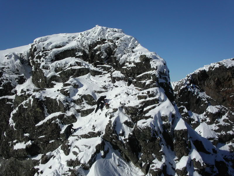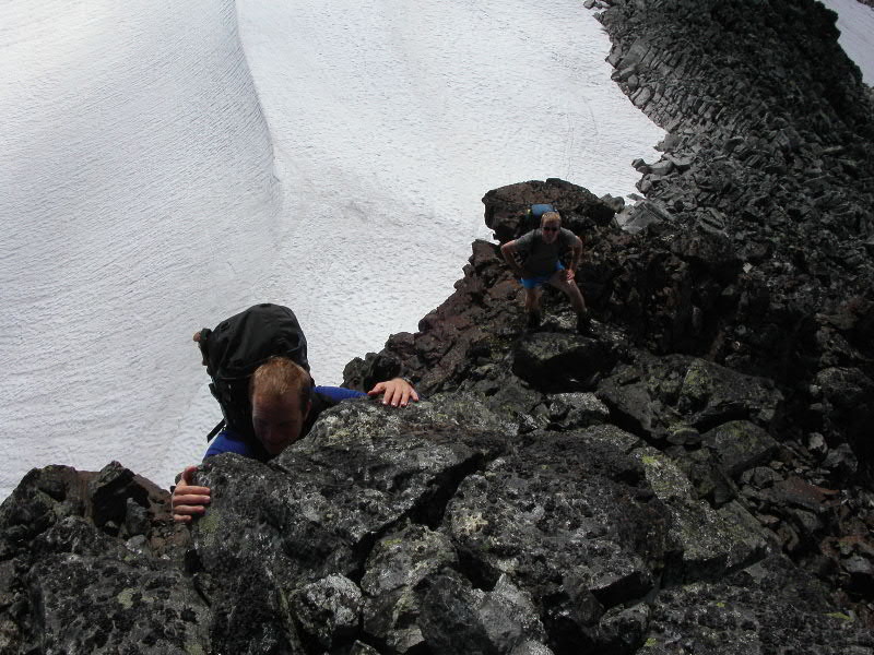 10. Har lagt ved bildet jeg tok fra klyvingen opp sørøstryggen på Mjølkedalspiggen (2040 moh) - se nederst. Per Rune som er nærmest, er iferd med å klyve opp den biten som kanskje var mest luftig oppover. Det er tatt ovenfra og ned, så vanskeligheten opp dette trinnet er kanskje ikke lett å bedømme. Vi kom ihvertfall alle 3 veldig lett opp.