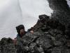 3. Hei Ivar! Du vet, sånn som vi virra rundt på breen i tåka måtte det jo bli noen knuter på tauet etterhvert... Nei, men det er som du har observert noen knuter på tauet ja. Vi lagde noen knuter mellom hver av oss, og de skulle fungere som en brems dersom en falt ned i en sprekk. Når tauet skar seg ned i snøen, skulle knutene hekte seg fast og holde igjen vekten av den som hadde falt nedi. Ulempen er at de kan bli i veien ved selve redningen. Jeg hadde ikke hørt om dette tidligere selv, men Coni hadde lært dette fra Østerrike.