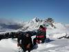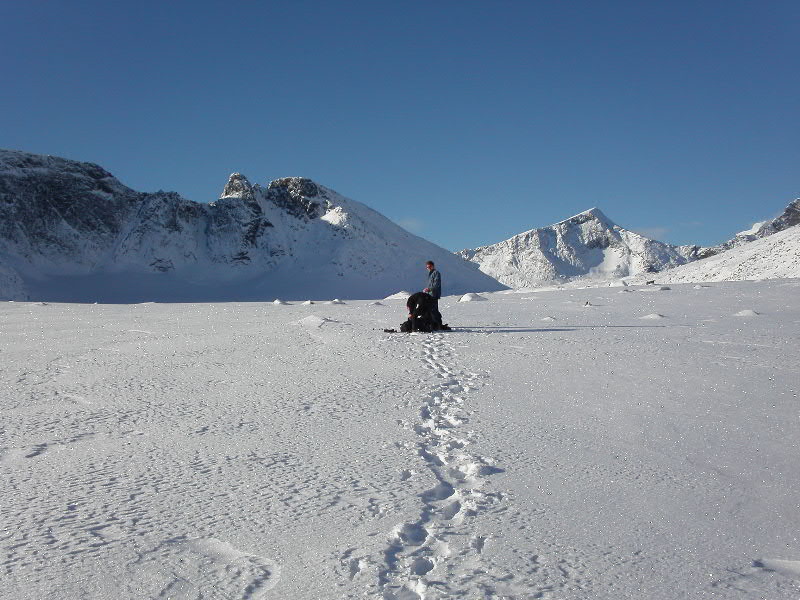 7. Vi hadde aldri 60 grader opp breen (heldigvis). Som Morten også skriver i et tidligere innlegg, kom vi fram til at det var nærmere 45 på det bratteste, helt øverst på bildet. Der vi står på bildet var det nok rundt 40 grader, så Svein, det var ikke dumt tippet. Faren for å skli ut med de forholdene vi hadde var meget liten. Vi lagde skikkelige trinn oppover i nysnøen, så hadde vi akt, ville ikke farten ha blitt så stor. Dessuten ble breen noe slakere nedenfor oss. Vi følte derfor aldri behov for sikring. Helt øverst i bildet, da vi var innunder isveggen oppe til venstre, satte vi en isskrue som sikring. Etter det jeg skjønte på Coni, var det mest for å få prøvd noe av utstyret vi gikk og bar på... Riktignok virket det langt ned da vi var der oppe, men som sagt, faren for at en aketur hadde ført oss ut i evigheten, var minimal. Til det hadde vi altfor gode forhold. Isskruen var altså eneste sikringen vi satte på turen. Snøankeret lå godt forvart i sekken.
