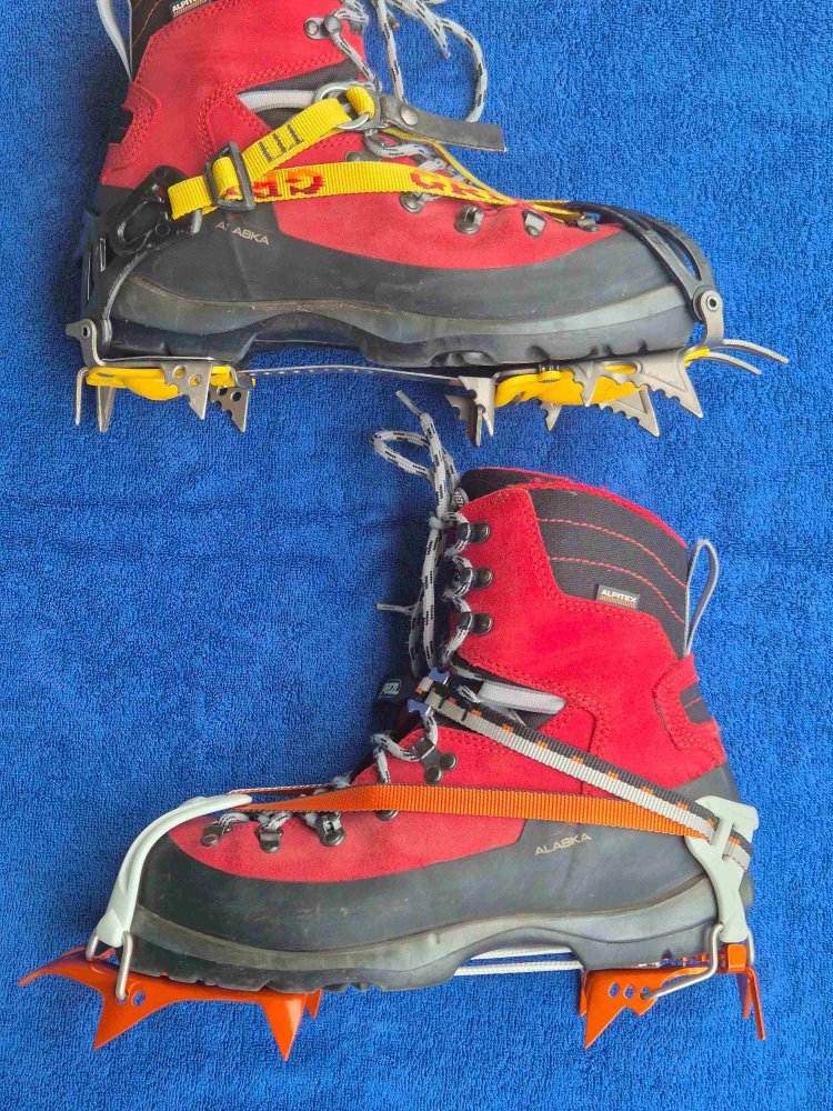 Med ski på snødekt bre - Pakker du stegjern? Og annet...Swiss John svarte på sneakyowl sitt emne i Ski og vinteraktiviteter To løsninger for BC-støvler: Over: Grivel Air Tech. Nedenfor: Petzl Leopard. Merk at Grivel-modellen ikke er modulær – du bestiller den enten med kurver, som vist (modell «New-Classic») eller med spaker bak/stang foran (modell «New-Matic»). Eksemplet som vises på bildet mitt veier 430 g (én stegjern). Petzl (modell Leopard Flexlock) kan endres til spaker/stang på nøyaktig samme måte som modellene Irvis og Irvis Hybrid. For- og bakdelen er av aluminium og de er koblet sammen med dyneema-snor. Eksemplet som vises på bildet mitt veier 190 g (én stegjern). Jeg har også Petzl Irvis, men for øyeblikket er de konfigurert for randonnée-støvler (spak/stang).