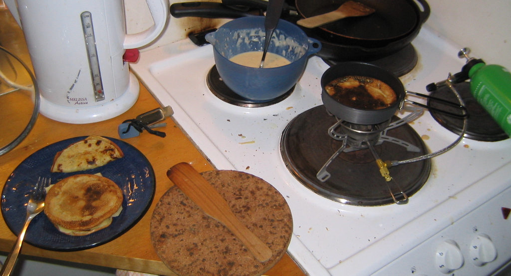 Jeg har ganske nylig anskaffet meg en primus omnifuel, og i samme slengen tok jeg med en "primus litech trek kettle". Det er en liten (1l) kjele med lokk/stekepanne laget i hardanodisert aluminium med titan non-stick-belegg. Har selvfølgelig prøvefyrt primusen opptil flere ganger, og samtidig tenkt på dette med pannekaker på tur. Så da måtte jeg prøve Rørte sammen en røre og fyrte opp primusen på kjøkkenet. Pannekakene ble nydelige, og vil mest sannsynlig smake ca 100 ganger bedre ute i en snøfonn eller under et tre eller lignende.