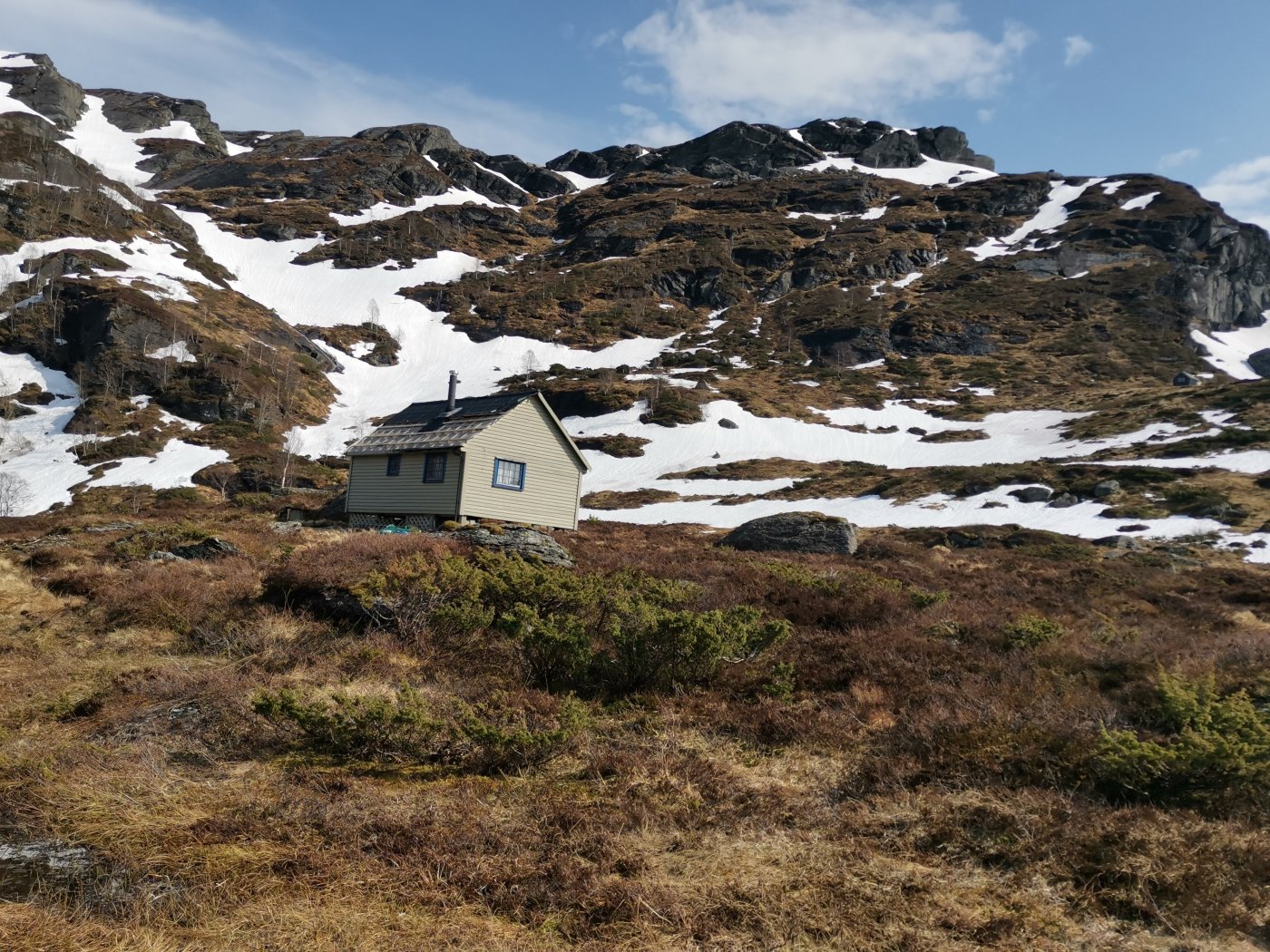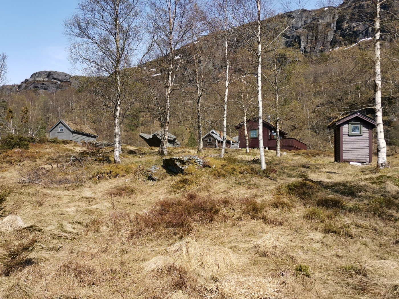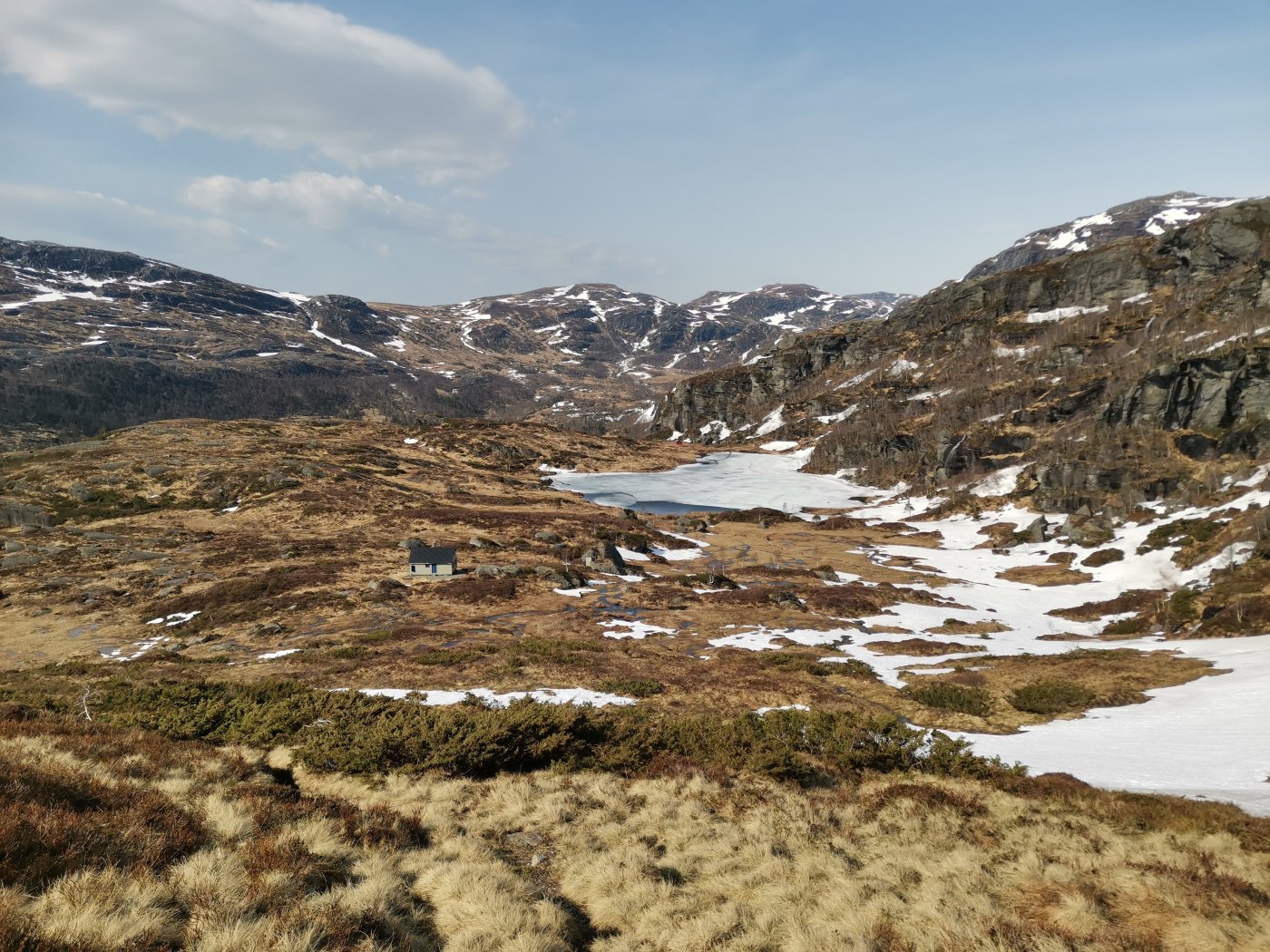 1.mai var det sommer og sol her så det ble og ta en tur inn ti Campingvognå og gjøre den klar til sommer. etter jeg var ferdig med og vaske \ beise terrassen hadde jeg fortsatt litt tid igjen før det ble kveld og solå var fortsatt på sitt beste. Turen endte opp på 14,39 km på 04:45 timer inkl små pauser der jeg var innom Liabøstølen , Akslandsstølane og Vasstølsvatnet. vi er da i Vindafjord , Imsland ikke så langt fra Sauda. Fra Akslandsstølane kan du ta turen opp til Akslandsnuten som er 821 meter er den fjerde høyeste toppen i Vindafjord. her er Vasstølsvatnet, bra fiske og bade vann. inn til venstre hvor det er mest snø på toppen ligger myrstøl. der kan du finne kong Håkon 7 sitt sirlege monogram på steinhella. Her har du Akslandsstølane, det er faktisk første gang jeg er oppe her og besøker disse. her ser du ned på Myrstøl , er nokså høyt oppe og bilde er tatt fra en Huawei mobil med litt ymse zoom. det var sol og fint vær og jeg gikk tomt for vann så da var det godt at det var noen snø flekker der jeg kunne smelte snø i flaskå. Pause på toppen og var helt utkjørt etter mye gåing i tunge oppover bakker. sinnsykt mye oppoverbakker igjennom hele turen så da får man virkelig testet ut hvor god kondisjon man har. kom meg til topps og turen stopper der da jeg ikke hadde med meg bedre klær til og vandre i snø. inn til høyre går turen til Akslandsnuten. det blåste nokså bra her oppe og jeg gikk i kun netting og t.skjorte. På vei ned gikk jeg innom Liabøstølen , denne stølen ligger ved vasstølsvatnet helt på andre siden.