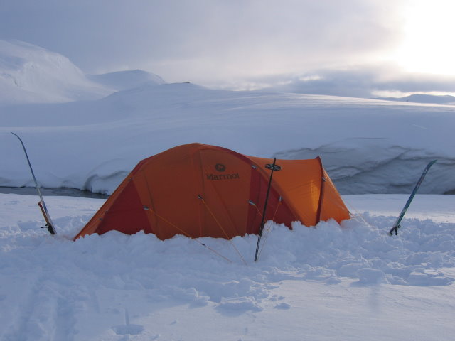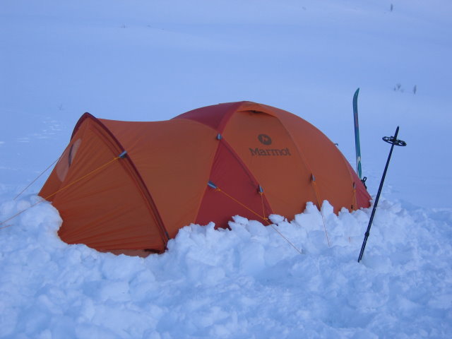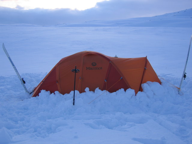 I forhold til hva du får igjen for vekten vil jeg ikke si meg helt enig her, bare litt enig. Teltet har tross alt 6 stenger, og forteltet kan stå vha kun 2 av disse! I tillegg så er dette et 2-mannstelt som det faktisk er plass til 2 personer i. Og, som du skriver, til nød 3. (på sommerturer regner jeg med dette skal gå greit, hvertfall med 2 voksne og et barn) Hvis du fordeler 3,7 - 3,8 kg kg på 2 voksne på en vintertur, så er det under 2 kilo pr person å bære. Det er ikke lett å finne tilsvarende lett telt for 1 person til vinterbruk. På soloturer om vinteren blir det riktignok i tyngste laget, men mtp hvor godt dette teltet synes å være, så mener jeg det er verdt den ekstra vekten man må bære på. Jeg fikk brukt det 3 netter, 2 på fjellet med snøunderlag, og 1 natt nede i dalen på barmark. Så litt om de tankene jeg har gjort meg med teltet: Positivt: Det står vanvittig stabilt, regner med du må passere orkan vindstyrke og vel så det hvis du skal få dette teltet til å blåse bort. (forutsatt at det er bardunert og festet skikkelig) God ventilasjon. Totalt 4 lufteåpninger i innerteltet, pluss 2 lufteåpninger i taket på ytterteltet. I tillegg skal det jo være lufting under ytterduken. Kan ikke se at det vil bli problematisk å bruke dette teltet om sommeren heller. Mange oppbevaringsmuligheter til div. utstyr på duken i innertelteltet. I tillegg er det laget et slags "tørkeloft", + at det er en ring i hvert hjørne av taket, der det er mulig å feste tau etc. for å tørke klær o.l. Lett å slå opp. Det tar liten tid, og har du gjort det noen ganger er det ikke noe problem å huske hvor de forskjellige stengene skal stå. God takhøyde! Nå husker ikke jeg takhøyden i farten, men den er ganske høy i forhold til størrelsen på teltet. Sideveggene på teltet er også ganske vertikale, så totalt volum innvendig føles stort. Teltduken blir skikkelig stram, så sammenlignet med f.eks Savlbardteltene fremstår Thor 2 som et mye bedre telt på dette punktet. Pluggene som fulgte med er jo ikke til bruk på snø, men på barmark var de veldig bra. De er på en måte 3-kantet (sett ovenfra), og det går fint å bruke føttene for å trykke de hardt ned i bakken. For å sammenligne med f.eks Helsport har Marmot laget en god patent her. Til å være et 2-mannstelt er forteltet stort! Det er en ekstra stang som "vippes" fremover for å strekke ut duken på forteltet. Sammenlignet med f.eks Helsport Trollspiret får du et stort fortelt her. Og hvis det blir fullt av sekker og utstyr der, så har man en inngang i andre enden av teltet som også går greit å bruke. Negativt: Bardunstrammerne som fulgte med var rett og slett latterlige. Laget av plastikk som var litt bøyelig. Jeg fikk ikke brukt de, men det gikk jo greit å stramme opp bardunene likevel. I tillegg kommer teltet levert uten bardunene montert, kun en kveil som man kapper til ønsket lengde + 4 bardunstrammere (som i tillegg til å være dårlige, var det også for få av de.) Men ekstra barduner kan ikke være hverken dyrt eller vanskelig å få fatt i, Helsport har jo skikkelige som jeg regner med kan kjøpes seperat? Dette var det eneste negative jeg kom på i farten, jeg har bare et par kommentarer til som ikke er så lett å se hverken det positive eller negative i: 1. Teltet har ikke stormklaffer. Nå er det sikkert nok stormklaffdiskusjoner her på FF allerede, så jeg gidder ikke lage en ny diskusjon. Med stormklaffer ville sikkert dette teltet også fått litt dårligere ventilasjon. 2. Det er mange justeringsmuligheter på ytterteltet, duken kan "trimmes" opp og ned etter behov. Det kan virke litt uoversiktlig og merkelig i begynnelsen, men regner med dette bare er en vanesak, og at det går fort og greit etterhvert. 3. Vekten. Som nevnt tidligere er det ikke en skikkelig lettvekter, men du får igjen utrolig mye sikkert telt i forhold til vekten! (men skal du på alenetur og er en gramjeger er sikkert ikke dette teltet førstevalget) 4. Prisen. Koster 5500. Hverken avskrekkende dyrt eller veldig billig. men det er jo mye billigere å kjøpe det i USA...