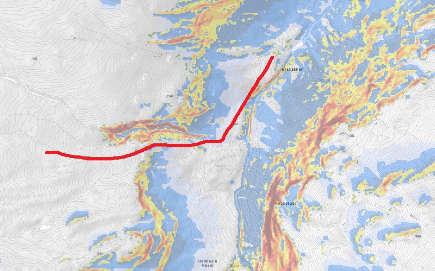 Tanken var først å gå opp Lunddalen og finne en vei opp til Hestdalshøgdi. Ser enkelt steder at det er angitt at man kan gå på ski opp langs siden av elva Grjotåi, men samtidig ser det bratt ut her på kartene.