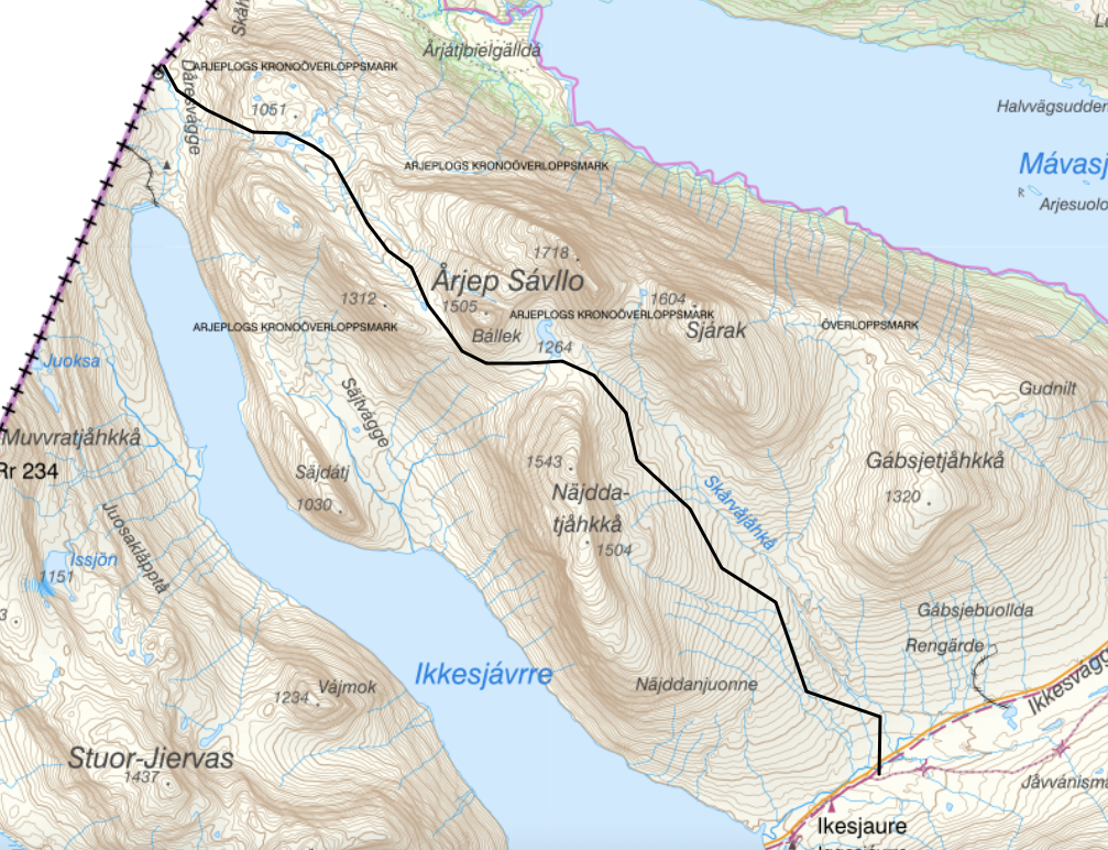 Her e min plan dag 1 i Sverige til röse 235. Det er ca 500 höjdemeter, men på en brekurs i Nigardsbreen, 20 år siden, gikk vi 700 höjdemeter dag1. Fra vann 1264, vis det er mulig håller jeg samme höjdmeter til jeg kommit förbi Årjep Savllo, därefter er det nedför.