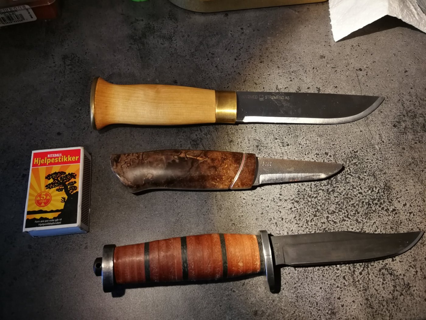 Min første kniv etter speiderkniven var en strømeng 5 samekniv. Det er en av de minste. Den kan man bruke til å skjære brød, smi pinner, gjøre opp fisk i tillegg til at den tåler mye misbruk. Jeg har fortsatt min. Til mine gutter kjøpte jeg kniver uten spiss. Nå når de har blitt større har begge fått litt tøffere kniver av merket buck. Jeg kjøpte meg en ny strømeng. Strømeng øverst, kniv uten spiss i midten og tøff buck nederst. Den tøffe kniver er tøff men egner seg ikke til å smøre på en brødskive. Nå leste jeg ikke hele overskriften og knivene er kanskje ikke de billigste. Men de holder en generasjon om man passer på. Tore- 9 svar