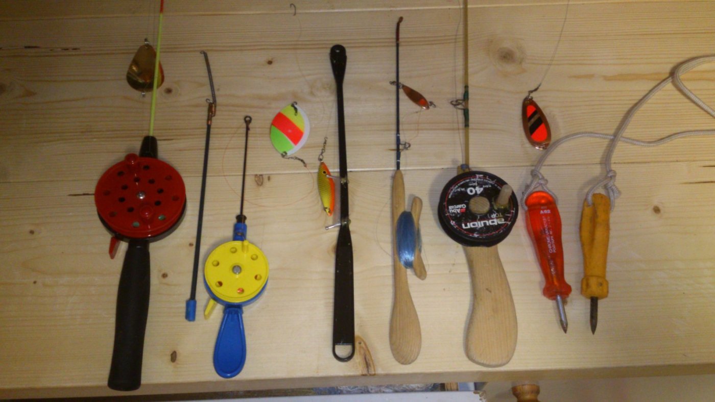 17. Du trenegr ikke så veldig avanserte greier for å fiske på isen, i hvert fall ikke her vest hvor det sjelden er is og hvor STOR fisk er over 250 gr. Men selvfølgelig er det viktig at kroker og snøre er tilpasset det fiske man bedriver. Hos oss er det hovedsaklig mindre røye og en og annen ørret som fiskes på isen. Her er en del av det jeg rasket sammen fra isfiskesekken min. To av pilkestikkene er kjøpt og resten er laget i løpet av min tid som leder i speideren. Ved siden av den første ligger en ekstra hjemmelaget tupp med ekstra følsomt toppøye som er laget for å passe i den ene kjøpte stikka. Nr. tre fra venstre, den sorte, er laget av håndtaket til et eller annet kjøkkenredskap som jeg kjøpte på Europris for en neve "parkometerpenger". Vi laget et dusin stykker av denne typen i forbindelse med en isfiskedag i speideren, og de funket faktisk ganske bra. Nr. 4 0g 5 er spikket / laget av tre, en gammel tom senspole og tuppen av en gammel fiskestang, og så til slutt et par ispigger som er laget av to ødelagte skrujern. "Nød lærer naken kvinne å spinne", men her hos oss kan man vel kanskje si at "Is lærer sulten mann å fiske" eller noe sånn. . .
