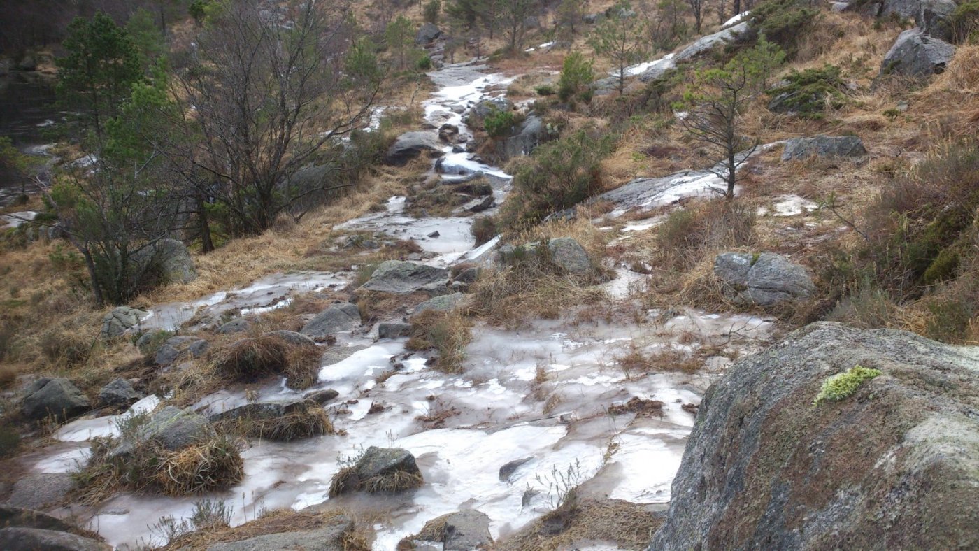 Nå har jeg mest erfaring fra fjellene på vestlandet, syd for Haukeli, og her ville jeg ikke tenkt på å dra med meg noe som gikk på hjul. Det er en del anleggsveier i dette området, men disse er som oftest av så god standard at du kan bruke hva som helt av kjøredoninger med hjul. Ellers ute i terrenget er bæring det som fungerer best. Siste istid skrapte Østlandet fritt for stein og grus og da isen smeltet så la den dette igjen her hos oss. Her er et bilde av en typisk sti i mitt nærområde. Bildet er fra i vinter, men om sommeren blir isen byttet ut med vann og i tørre perioder så er det bare steinene som vil være problemet. Ikke særlig fremkommelig med noe på hjul her.