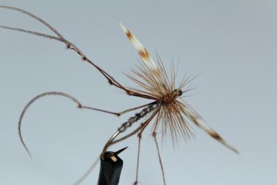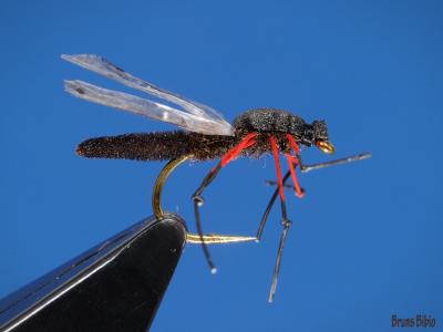 Jeg laget en gang noen Daddy long legs tørrfluer hvor jeg brukte enkle fibrer fra fasanhalefjær til bein. Knyttet noen knuter på disse og da så de akkurat ut som beina på en slik stankelbein som har krasjet på vannet. Kanskje dette også kunne være en idé for beina på Bibio pomonae. Kanskje rød kalkunhale kunne brukes og så tilleggsfarge med sort vannfast tusj? Jeg synes en del syntetisk materiale ofte blir litt stive. Ref. bilde. Bare en idé som jeg kanskje kunne prøve ut i helgen.