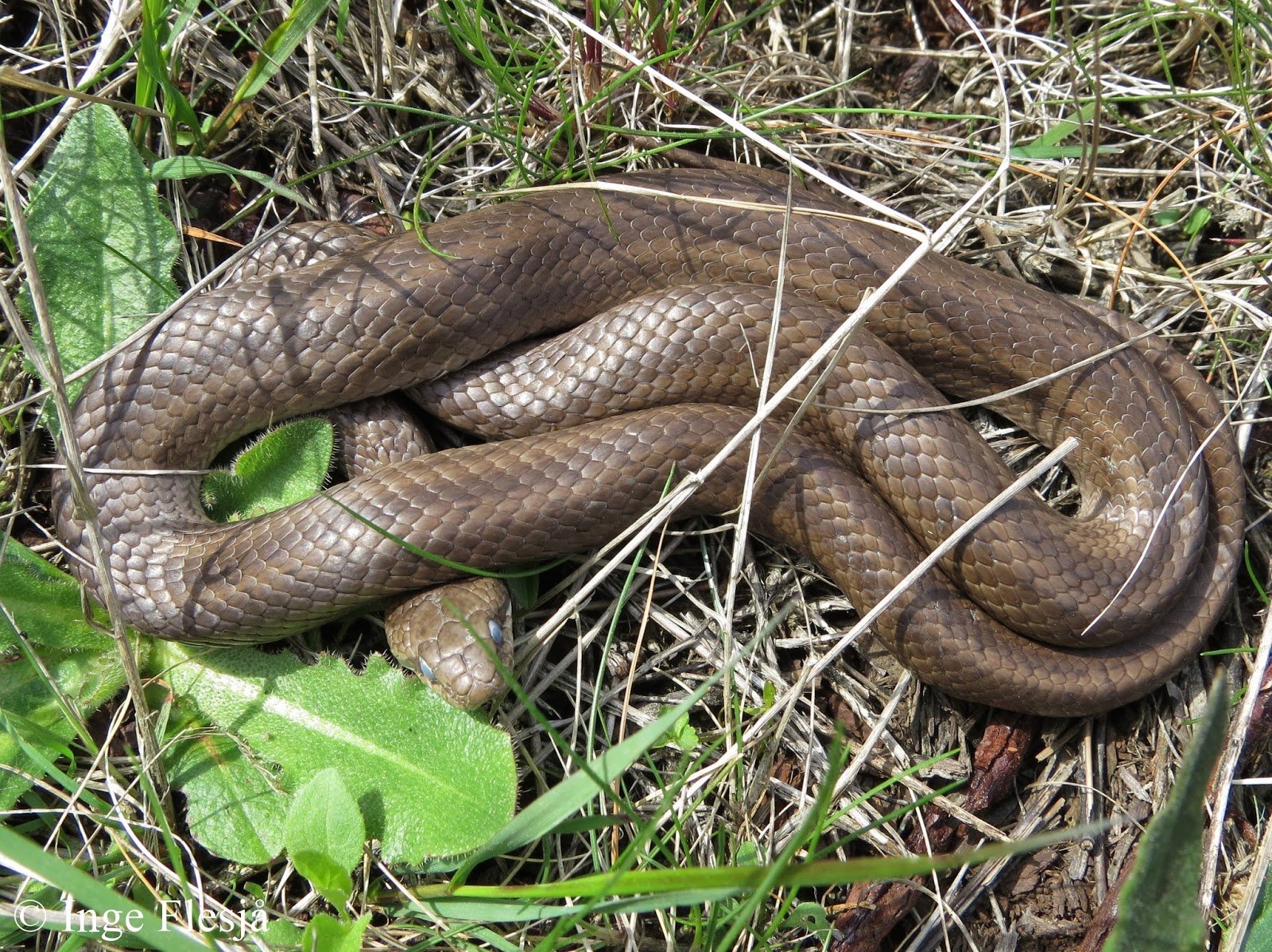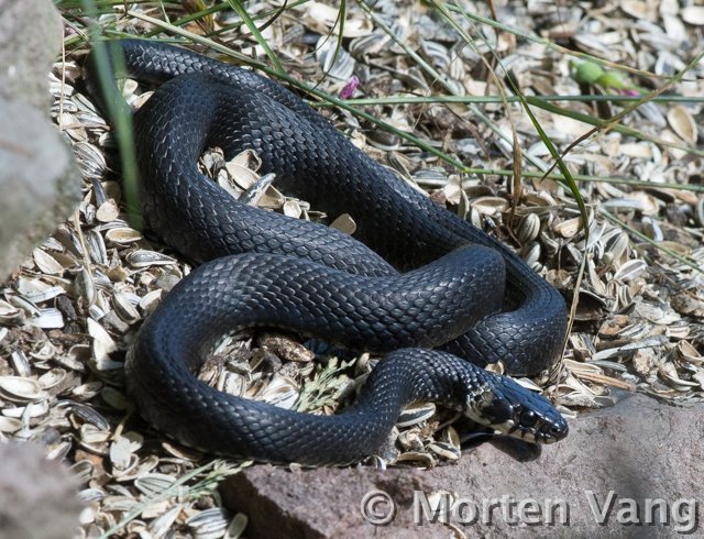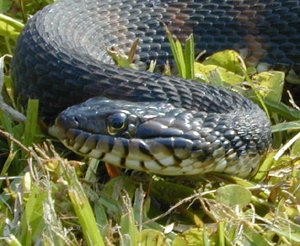 Hvis det er en buorm så burde det vel ha vert mer tydelige skjellmønster. Jeg holder en knapp å sleve, eller stålorm. Både fargen og den blanke overflaten tyder på dette. Noen stålormer har tydelige striper lang ryggen, mens andre er mer jevne i fargen. Den blir sjelden mer en 45 cm eller en halv meter, men en så stor stålorm virker ganske svær siden det ikke er vanlig å se så store eksemplar. Stålormen er en øgle og det ses lett på den litt spesielle hodeformen og så kan den blinke med øynene. Det gjør ikke slangene. Jeg mener at det finnes en amerikansk slektning til buormen, amerikansk vannsnok, som ikke har de gule nakkeflekkene, men er litt usikker. Norsk buorm er ofte litt flekkete, men kan i noen tilfeller være nesten svart. De lyse nakkeflekkene kan også være mindre markerte på noen eksemplarer, men skjellmønsteret er vanligvis ganske tydelig. Norsk buorm Banded Watersnake