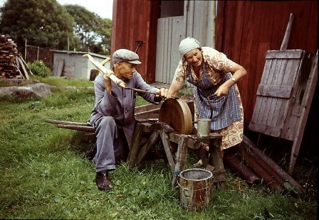 Ikke slip knivene på noe som det ikke er vann på. Smergelskive eller smergelpapir, båndsliper eller masin med skive vil ødeleggekniven på sekunder. Bruk kun roterende slipestein med vann eller bryne med vann på. Hvis du bruker roterende slipestein så pass på at du ikke har for høy fart. Da kan du få varmgang og da ryker herdingen i stålet. Gammel eller ny type spiller ingen rolle så lenge det er godt med vann på. https://www.tormek.com/uk/en/grinding-jigs/svm-45-knife-jig/ Men det finnes noen enkle innretninger som hjelper oss som ikke har dette som fag. https://www.bazaargadgets.com/no/knife-sharpener-med-kniv-sliping-stones-blade-slipe-verktoy.html Til sliping av øks kan du bruke en fil for å fjerne små hakk og så et bryne til slutt. Det ligger mange gode råd på YouTube. Både for sliping av kniver og økser. Her er et par tips for øks fra YouTube