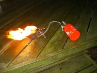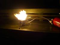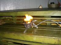 Så var det klart for primustest nummer to. Reparasjonen var vellykket og beholderen holdt trykket med glans, men første forsøk var ikke noe særlig bedre enn sist. Bare en liten forskjel. Trykket holdt testen ut. Det blåste en liten trekk langs husveggen, men da brenneren var blitt varm var det bare å åpne krana. Det ble et lite sankthansbål i dag også. Men det fulgte med en ekstra dyse og ved nærmere ettersyn å kunne det se ut som om den hadde noe mindre hull. Dysa ble skiftet, men resultatet ble det samme . Konklusjon: Primusen brenner gass rett fra fryseboksen, men ikke parafin og da kan man sikkert også regne med at det ikke er noen vits i å prøve diesel. Nå gjenstår det bare en test med bensin. (Skal bare få tak i en asbestdrakt og et stort CO2 apparat.)