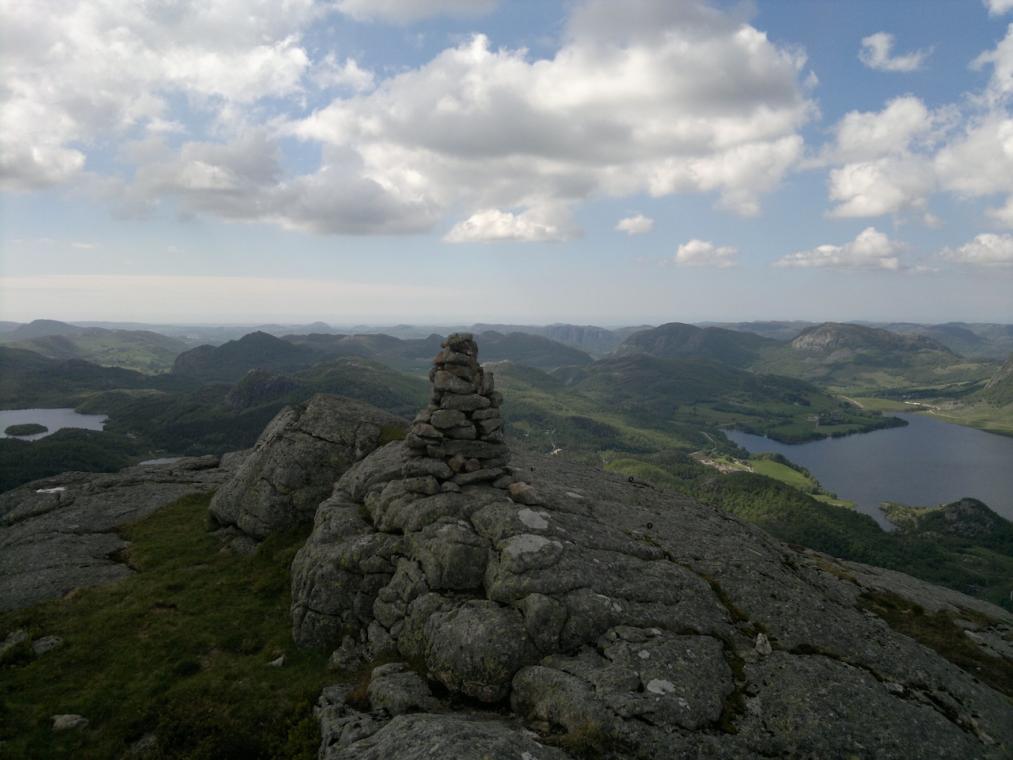 Årets første tur for meg ble også en liten topptur. Kjørte til Madland, opp til Brekko og parkerte like nedenfor skiskytteranlegget. Turen opp til Gloppenuten (630 m.o.h.) tok ca. 2 timer, og turen tilbake gikk på 1,5 time. Det var stor vassføring i bekkene og myrene var veldig våte. Stien var isete og det var mange store snøfenner som måtte forseres. Snøen var så rotten at jeg sank gjennom og da nådde den meg godt over knærne. Her hadde nok truger vert tingen. Været var ikke særlig bra. Mye vind, haglbyger og tåke på toppen. Den fine utsikten som mange snakker om så jeg ikke så mye til. Bildet er ikke fra dagens tur og jeg ser nå at steinen på toppen av varden var falt ned. Kan det være den sterke vinden vi hadde i slutten av 2012?