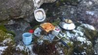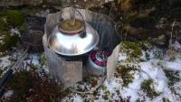 Var på tur i dag og kokte på gass. Temperaturen var vel ca. rundt 0 grader og det tok ikke lenge før primusen begynte å hoste. Gassboksen ble for kald. Løsningen ble å ta gassboksen inn i varmen.
