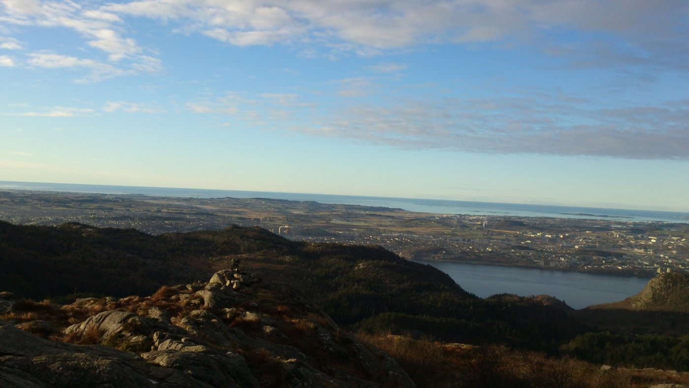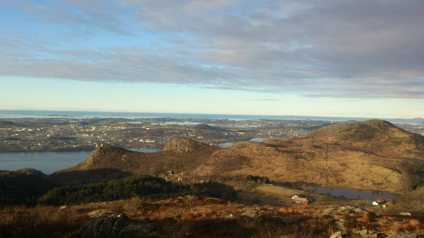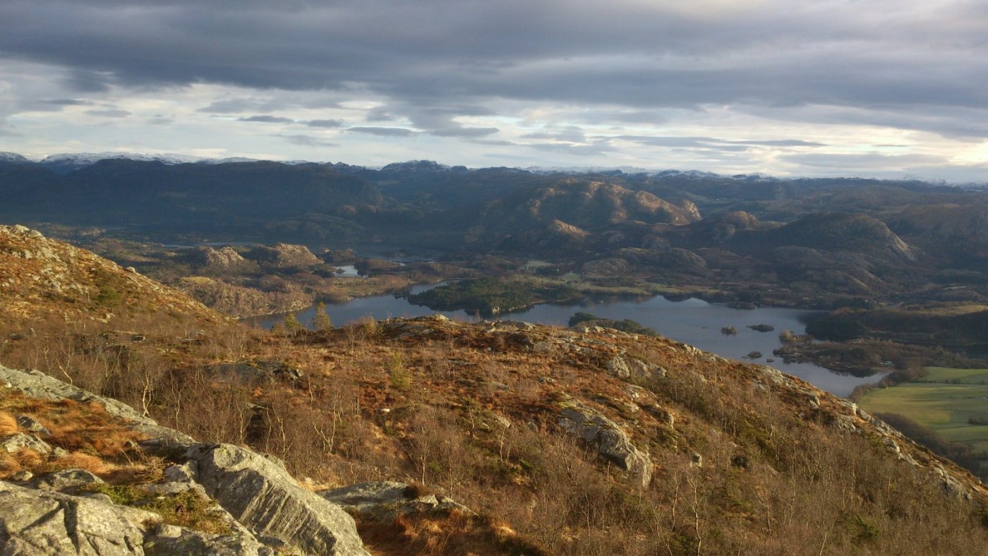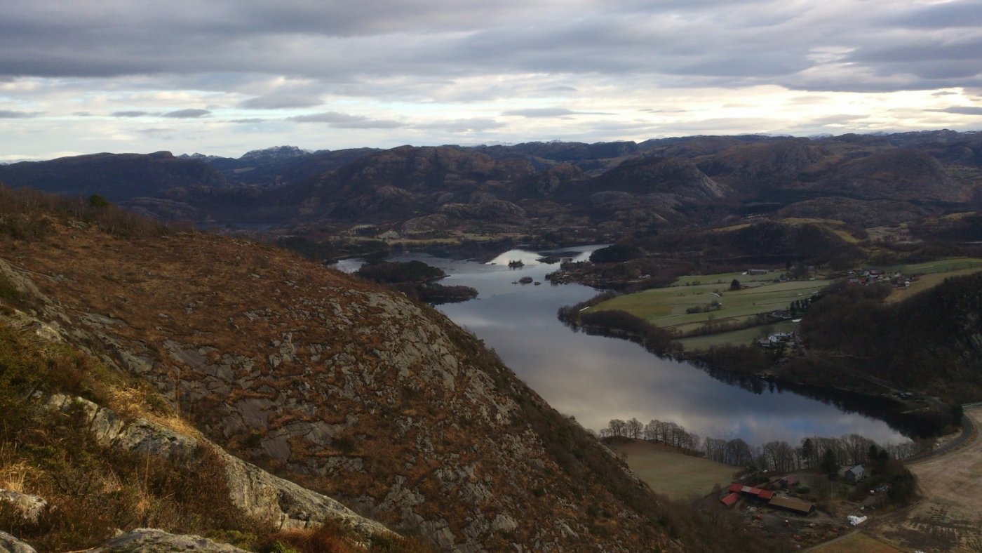 Ja ja, så ble det litt tur like vel. Fjordåret har vert sterkt preget av alt for lite tur og en stadig stigende turabstinens. Både på grunn av at legekontorer og sykehus har vert gjenstand for flere besøk enn omliggende naturområder og på grunn av at været stort sett har vert av en særs dårlig kvalitet de dagene der tid og fysisk form har tillatt at turklær og sko blir hentet fram fra skuffer og skap. Siste sykehusbesøk ser ut til å ha hatt en liten positiv effekt, hvis jeg kjenner godt etter, og i går så var også været av en slik kvalitet at det bare måtte benyttes. Slikt vær er sjelden vare her vest, men i går var det faktisk av svært bra kvalitet. Turen ble ikke så lang, men det ble Gramstad og en tur over Mattirudlå og Bjørndalsfjellet, og siden jeg ikke er så veldig flink til å holde meg på "den smale sti", så ble det noen avstikkere bort fra en etter hvert noe slitt tursti. Bakken opp til Mattirudlå med sine 346m, en stigning på ca. 140 meter, er nok den tøffeste på turen med partier hvor det nesten føles som at man kan støtte seg på nesen. Men turen gir også en fin utsikt østover mot Lutsivannet, og med dagens vær, og selv om det noen steder lå is på vannet, så hadde det sikkert også vert fint med en tur i kanoen. Lutsivassdraget strekker seg innover mot Ims gjennom flere vann og smale pasasjer og gir kanobrukere og andre som flyter, en fantastisk mulighet til f.eks. å bruke 2 -3 dager med telt og sovepose bare noen minutters kjøretur fra Sandnes og Stavanger. Men selv med en kondisjon som ligger godt plassert et sted langt nede i kjelleren så nådde jeg toppen av Mattirudla og fikk nyte utsikten over nord Jæren mens jeg fikk igjen pusten og fikk fullt på med litt fludium. Nordover kan du, på en klar dag, nesten se like til Karmøy og vestover er det bare krumningen på jorda som hindrer at du kan se like til England. Jeg fulgte stien over toppene mot Bjørndalsfjellet. Bakken var delvis frosset så det var ganske lett å gå. Jeg gikk opp til toppen langs den vanlige ruta, men på veien opp så ble jeg stående og lure litt på om det var nødvendig å gå tilbake samme vei eller om det fantes en alternativ rute, og det gjorde det. Bjørndalsfjellet med sine 362m gir en fin utsikt i alle retninger. Ned et bratt skar på sørsiden skulle vel ikke være helt umulig, og selv om en del av steinene var islagte så tok jeg sjansen på en bratt nedstigning. Det ser kanskje ikke så bratt ut på bildet, men noen steder var, på grunn av islagte berg og steiner, kanskje litt i det skumleste laget, men det gikk og vel nede var det ganske behagelig å kjenne på følelsen av å komme litt bort fra stien. Jeg vil tro at høydeforskjellen her er på godt over 100m. Selv om jeg hadde med både primus, kaffekjele og diverse rett i koppen produkter så ble det verken mat eller drikke, og etter nok en avstikker rundt Kuheia før jeg var nede ved bilen så kjente jeg at det begynte å bli rimelig tomt for energi. Det ble over tre timer med trasking i terrenget og klokka nærmet seg tre på ettermiddagen. Ikke rart at en liten enkel frokost var brukt opp for lenge siden. Ok, jeg kjører jo forbi IKEA på veien hjem og der selger de pølser i brød til bare kr. 5,- pr. stykk, nesten billigere en å kjøpe pølser i butikken, så det ble et lite stopp her også. (Jeg spurte ikke hva pølsene var laget av, men det var de sikkert.) "Og den som ikke en fridag kan nytta så, han fortjener da heller ingen fridag å få."