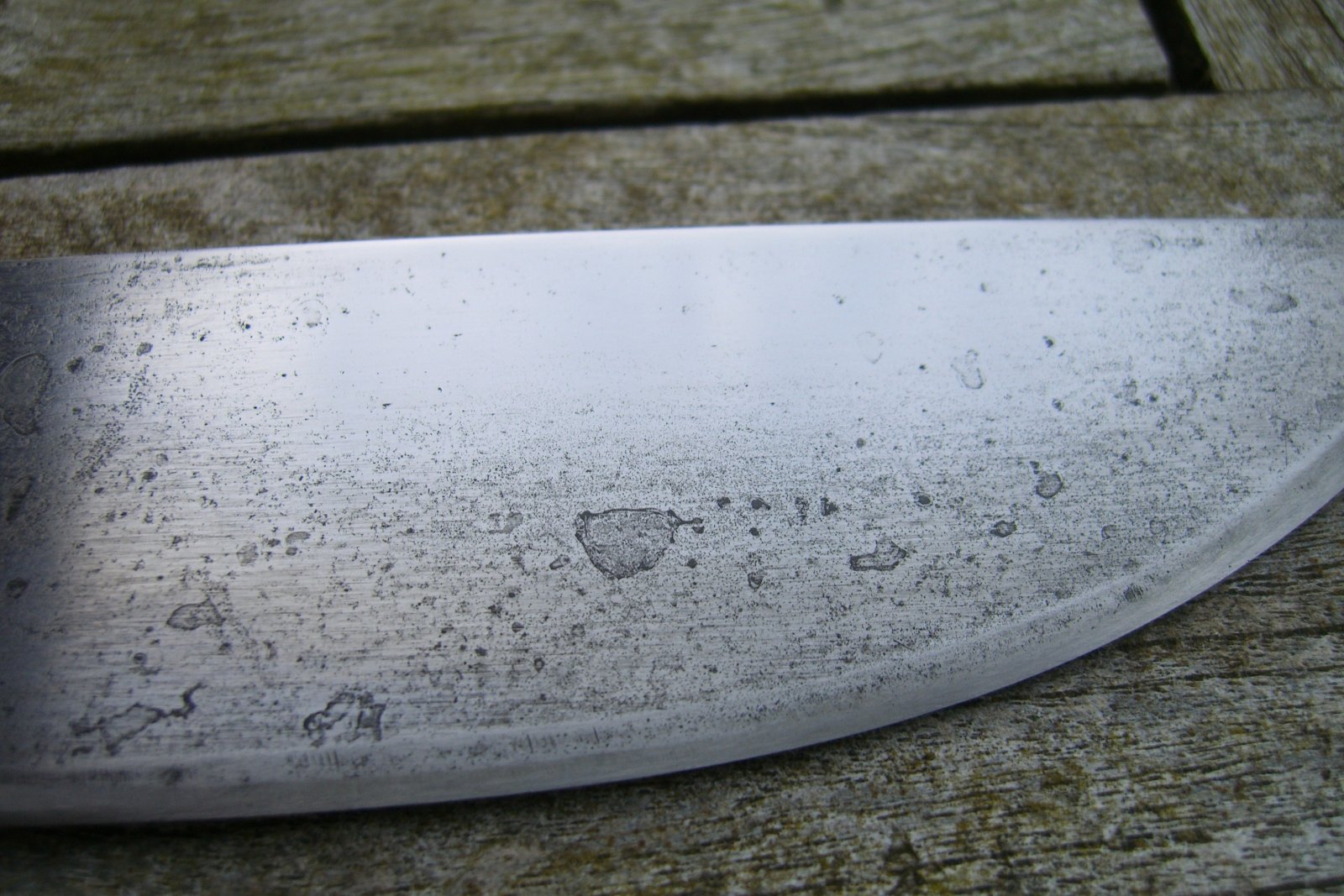 Å legge kniven i eddik vil kanskje fjerne overfladisk rust, dette er jo jernoksid, men hva skjer med stålet når det utsettes for eddik? Eddik er jo syre og vil vel angripe stålet enda mer? Sandblåsing eller tilsvarende hvor de bruker vann er vel det mest effektive, men hvis du ikke har tilgang på dette så er det mest effektive å fjerne overfladisk rust mekanisk. Bruk en roterende stålbørste på en drill, eller hvis ikke dette er nok så kan du bruke smergelpapir. Pussing eller børsting fjerner rusten og etterlater en del riper i stålet. Disse fjerner du med vannslipepapir. Du begynner med litt grovt papir og går gradvis over til finere og finere papir. Dette er et tålmodighetsarbeid, men resultatet blir som regel bra til slutt. Jeg har også en samekniv som jeg mistet, og da den kom til rette igjen var den ganske rusten. Her ser du hvordan stålet så ut etter at rusten ble fjernet. Jeg har ikke brydd meg med å polere den, men vi får se en dag hvis jeg savner noe å gjøre. Her har jeg gjort en liten test med vannslipepapir, og med litt tålmodighet så blir nok resultatet enda bedre. Jeg har en kniv som jeg kjøpte brukt. En Dyre Vaa fra Helle. Den hadde forrige eier slipt med et eller annet grovt slipemedie som hadde gjort den stripete og stygg lang hele eggen. Denne polerte jeg med vannslipepapir og nå er det så vidt det går å se spor etter mishandlingen.