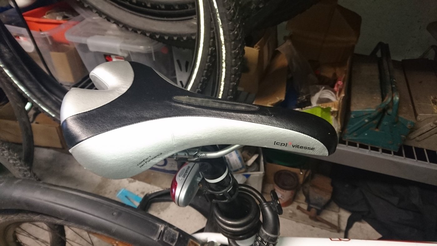Jo mer oppreist du sitter på sykkelen jo bredere sete skal du velge. Dette kommer av vektfordelingen mellom sete og styre. På den sykkelen som vises på bildet skal du ikke velge bredt sete, men jeg ville heller valgt et som var litt mykere. Setene varierer fra harde plastseter til mykere polstret sete, men på din sykkel bør det være smalt. Jeg har god erfaring med seter fra Vitesse. Siste gang jeg kjøpte nytt sete så ble et Vitesse skiftet ut. Det var til min sønns hybrid sykkel og han ville ha tilbake samme type som han hadde hatt før. Jeg søkte på nettet og fant et i en sykkelbutikk i Hellas, men det gikk helt fint å kjøpe dette setet fra Hellas. (Se bildet.) Det er ikke sikkert at du finner akkurat dette setet, men det finnes en del andre modeller som sikkert passer på din sykkel. Bare pass på at det er riktig innstilt. Innstillingen av sete, både høyde og avstand fra styre og krank har betydning for vektfordelingen mellom sete og styre. Det finnes en del tips på nettet og så hender det faktisk at noen sykkelbutikker har folk som kan, men det er ingen selvfølge. Og husk at det er forskjell på seter til menn og kvinner. De er visst ikke helt like mellom beina. https://www.klubbinfo.no/bckto/sykkelinnstilling.html Her er noen setealternativer fra Vitesse. https://neloscycles.com/Saddles-Seats-Fizik-Vitesse-Hp/ Et annet alternativ er et smalt sete av lær fra Brooks i England. Disse setene former seg etter brukeren, men de koster fra ca. 1200 kroner og oppover. Jeg har jobbet i en sykkelbutikk som solgte elsykler og vanlige sykler med "gammeldags" oppreist og til dels lett tilbakelent sittestilling og disse syklene hadde brede myke seter. Vi hadde kunder som ville ha bredere seter på sykler med fremoverbøyd sittestilling, men hvis de ikke hørte på rådene vi ga dem, så kom de tilbake etter en dag eller to og byttet det brede setet.