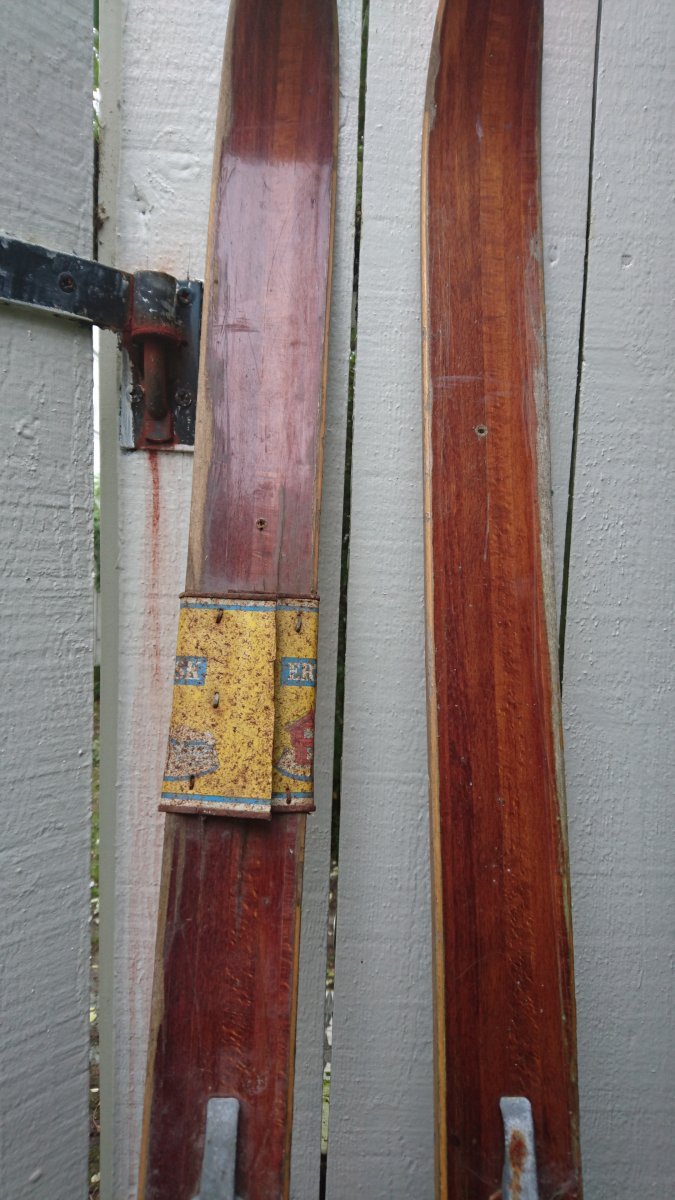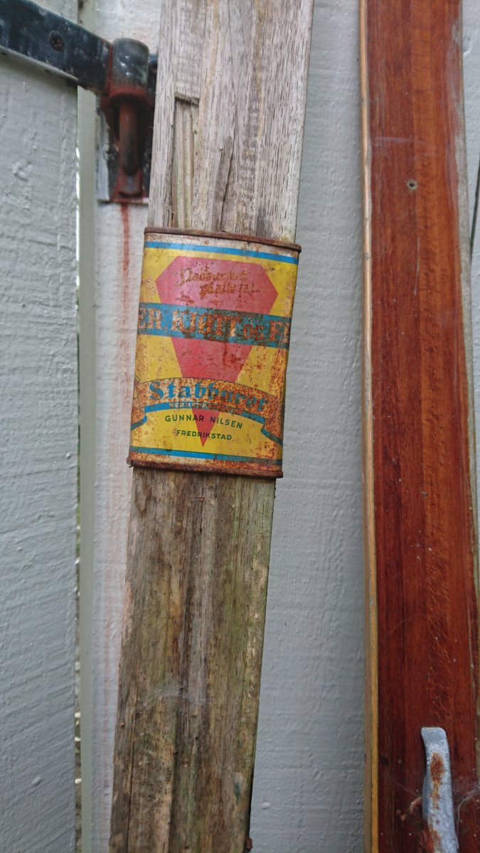 Var innom en bekjent som hadde storopprydning i garasjen og der dukket det opp et par gamle ski. Skiene var ikke så interessante, men den ene var brukket, og brekker man en ski så må man selvfølgelig reparere den, og har man ikke tilgang på passende verktøy og lim så får man ta hva man har. I dette tilfellet ble det en tom hermetikkboks som hadde inneholdt erter Kjøtt og Flesk.