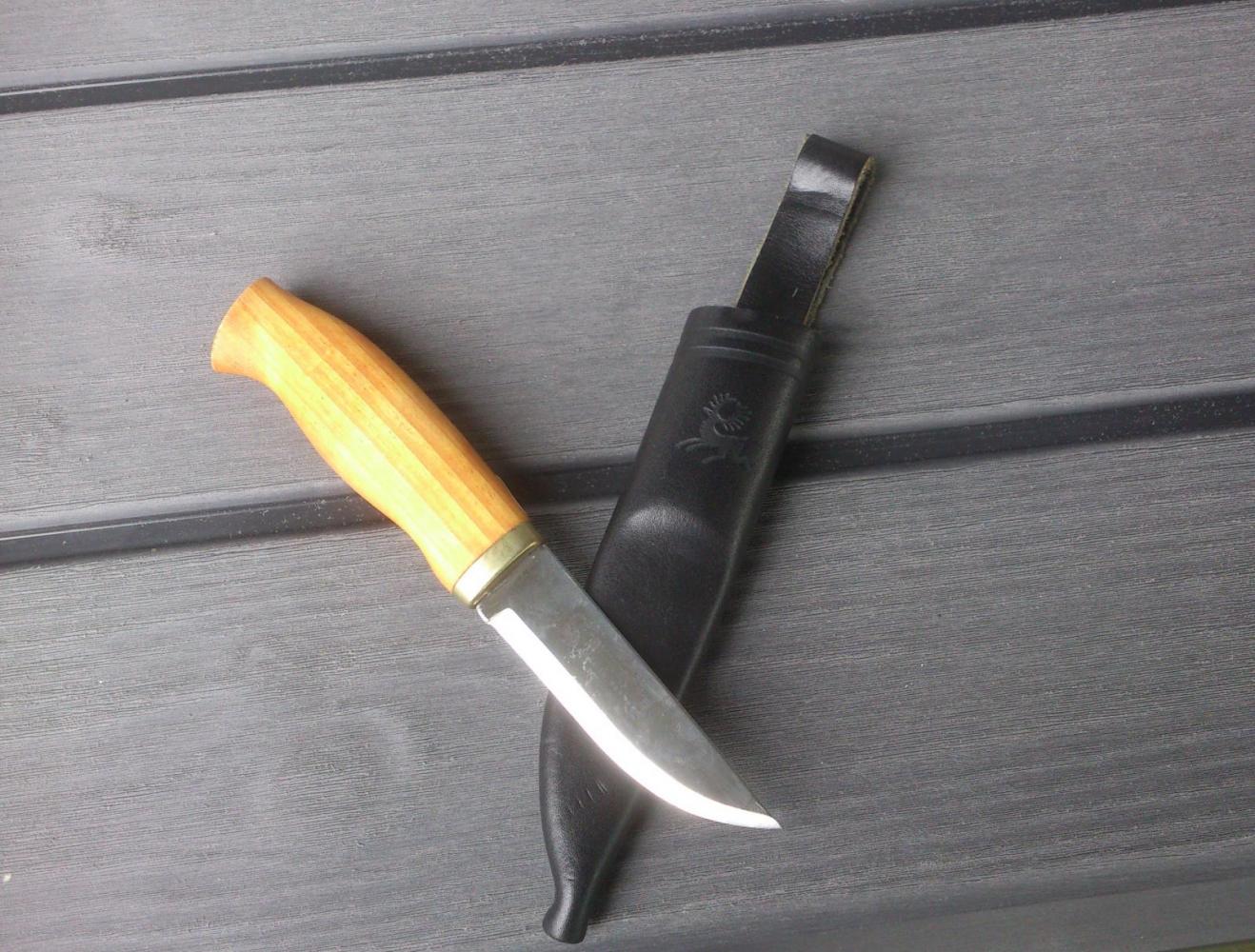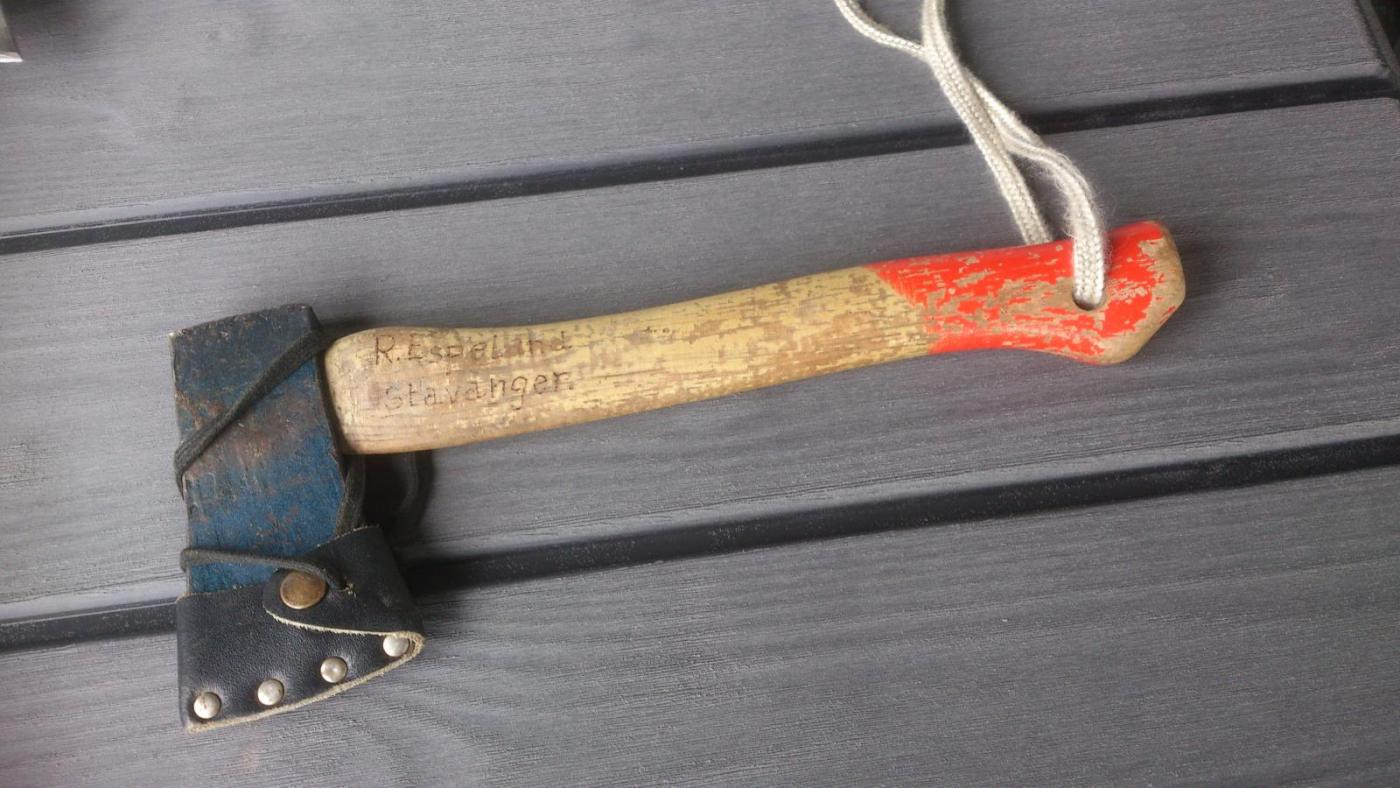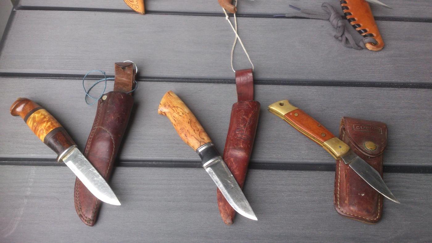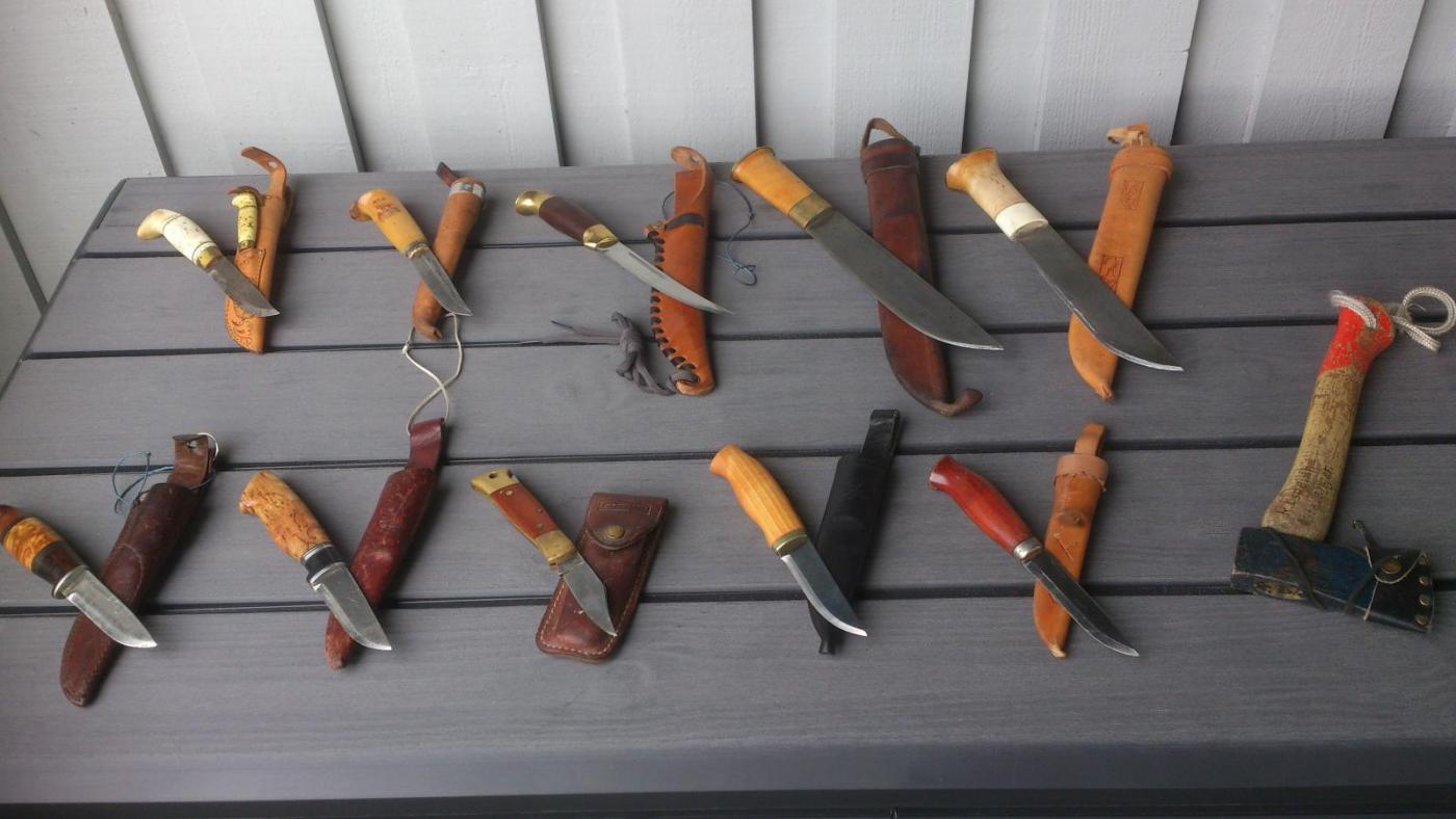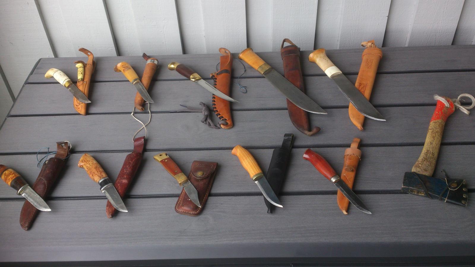 Jeg rasket sammen et tilfeldig utvalg av min etter hvert litt forvokste knivsamling og hvis vi ser bort fra alle Moraknivene som ligger rundt om i huset, stort sett alle steder hvor der er annet verktøy, så viser bildet undr at jeg har en del kniver som stort sett aldri blir brukt. De knivene som jeg liker best, bruker mest og som stort sett alltid er med på tur, i hvert fall en av dem, er disse: Og så en kniv som jeg sterkt kan anbefale som en første litt skikkelige kniven til f.eks. kona, sønnen eller datteren. Jeg kjøpte den hos XXL, den er laget av Brusletto og den var ganske billig, men overraskende bra, etter min mening. Og her er grunnen til at jeg stort sett aldri drar med meg store kniver som samekniv på tur. Er det nødvendig med grovere redskap enn en vanlig kniv så blir det øks.