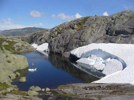 Jeg har falt gjennom snø om sommeren, men heldig vis ikke med vann under. Noen fenner kan smelte fra undersiden slik at de blir tynnere og tynnere, spesielt rundt kantene. Jeg krysset en slik fonn en gang og gikk rett gjennom. Jeg ble hengende på armene og sekken og beina dinglet il øse lufta under snøen. I bunnen var det en solid steinur så det var sikkert greit at jeg ikke datt helt ned. Men vann er noe annet. Jeg husker fra min tid i Hjelpekorpset at vi, en påskedag, fikk melding om en dame som hadde kommet nedover en bakke på ski. Hun skulle krysse en bro over en liten elv, men bommet på broa og havnet i elva ovenfor broa. Det tok 20 personer med spade og motorsag over en time å få henne frem og da skjønner du sikkert hvordan denne skituren endte. En annen fare er regulerte vann hvor isen ofte kan heng igjen mens vannet tappes ned. Spesielt inne ved land vil du kunne få sprekker og svak is hvor du kan falle gjennom. Da kan det være ganske langt ned til bakken under eller i verste fall til vannet. Jeg har hørt en historie fra Ryfylkeheiene hvor en person falt gjennom isen. Han endte opp på tørt land flere meter under isen og måtte ha hjelp for å komme opp. Går du gjennom en snøfonn som ligger over vann så ville jeg anta at dette vil være en livstruende situasjon, avhengig av hvor dypt det er og hvor sterk strøm det eventuelt er i vannet. Jeg ville være litt forsiktig ved kryssing av snø om sommeren hvis snøen ligger over vann og det er dypere enn ca. knehøyde.