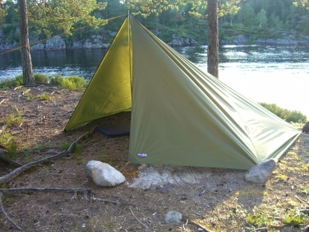 Det funker greit med stein hvis du ikke får satt ned plugger. Her er et eksempel på oppsetting av en tarp på en holme i Oggevann.