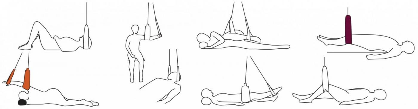 Et annet triks hvis du har stramme muskler i nakke og rygg kan være å lage en nakkeslynge. Fest et tau i en krok i taket. Så fester du en stropp, et belte eller lignende i den frie enden av tauet slik at det danner en stor løkke. Så legger du deg på ryggen, trer løkka rundt hodet slik at bakhodet hviler mot løkka ca 5 cm over gulvet. Slapp helt av og beveg hodet sakte fra side til side, eller 3 - 5 ganger til den ene siden og det samme til den andre siden. Gjentas flere gange, men pass på at du ikke sovner. 😉 Etter hvert som du blir mykere i nakken kan du strekke litt ekstra til hver side, men strekking er ikke poenget. Det er den jevne rolige bevegelsen som får musklene til å slappe av. Dette oppsettet pluss en del øvelser på et treningsstudio fikk jeg av en fysioterapeut en gang jeg hadde fått en prolaps i nakken. Se første figur i øverste linje og andre figur i nedre linje på tegningen under.