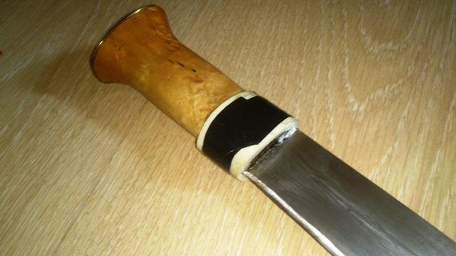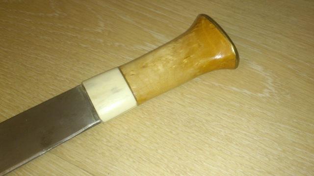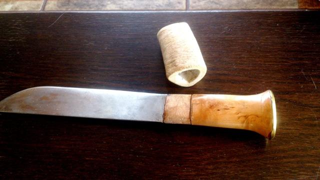Jeg henter opp igjen denne tråden siden det nå ser ut til at jeg nå klarer å få denne kniven i mer bruksvennlig stand enn den var i. Jeg fant et gammelt margbein som så ut som det var gnaget på av en hund. Dette burde jeg klare å få noe utav. Hullet i beinet ble frest noe større, treverket på kniven ble laget en del tynnere og så ble en passende lang del av beinet delt i to. Delene ble limt på skaftet med en passe mengde tokomponent Araldite lim og nå gjenstår bare sliping / pussing av beinet og et strøk lakk.