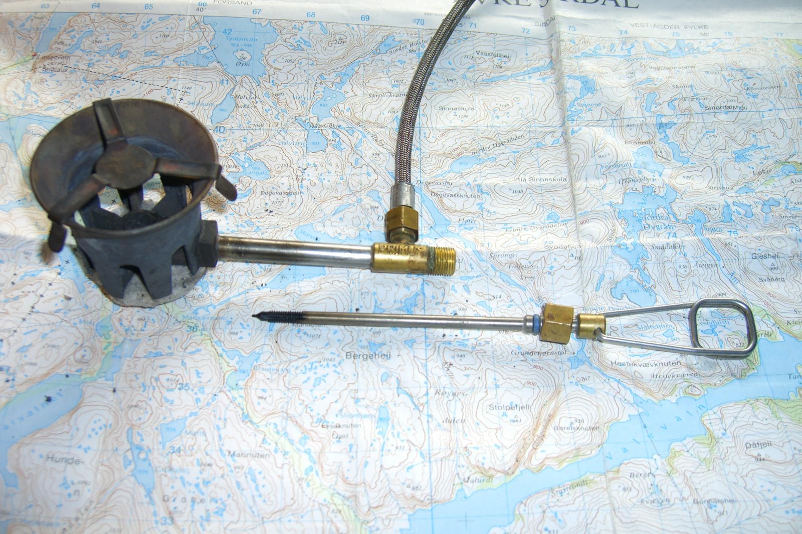 Jeg antar at det er denne delen som er problemet. (Jeg får prøve meg på en liten "brainstorming" her.) Fra bildene som finnes på nettet så kan det se ut som om den har to ventiler, men det har den altså ikke. Det er enten bare en blending på T-delen som er loddet på tilførselrøret til brenneren eller så kan det se ut som at denne delen har en eller annen funksjon, kanskje en sikkerhetsventil eller kanskje det bare er en blending av hullet der nåla skulle gått gjennom? Jeg fant en beskrivelse / test av denne brenneren på nettet som tar opp noe av problemet. https://www.flickr.com/photos/dougnienhuis/5377034625 Hvis du skal modifisere denne delen så må ventilhåndtaket være så langt at det kommer utenfor veggen på Trangiadelen som brenneren sitter i. Dette burde ikke være noe problem, men det som sikkert er et større problem er lengden på nåla og om setet i ventildelen som nåla skal gå inn i på trangiabrenneren er laget på samme måten som på Omnifuelen. Som du ser av bildene så er hylsa som nåla går gjennom en god del lenger på Omnifuelen enn på Trangiamodellen. Denne hylsa er loddet fast til brenneren og det er ikke så enkelt å bytte eller bygge om disse. Det eneste som jeg kan tenke meg kan være en løsning er å bytte hele brennerdelen hvis det lar seg gjøre. Litt vanskelig å se ut fra bildet av Trangiabrenneren. Men da får du nok en langt større kostnad. Ny brenner inngår ikke som reservedel i sortimentet til primus og bare denne nåla koster ca. kr. 800,- http://www.primusshop.no/reservedeler#/page/2 En mulighet kan være å forsøke å få kjøpt en brukt / utbrukt Omnifuel brenner, hvis det finnes, og bruke deler fra denne til å bygge om den du har. Jeg sjekket finn.no, men fant ingen ting der. Så var jeg innom eBay.com men der er det også bare nye brennere og repsett som selges. OBS OBS, det ligger en del billige multifuelbrennere på eBay som ligner på Nova, men pass deg for disse. Jeg har en sånn billig brenner som ble kjøpt på nettet og etter diverse reparasjoner, på ny brenner, så brenner den kun gass. Slik jeg ser det så kommer du ikke utenom å kjøpe en ny brenner, eller så hadde det vert interessant å høre hva de som lager denne Trangiabrenneren har å si til problemet ditt. Har den noen merking som sier hvem som har laget den? På Omnifuelen står det PRIMUS og det gjør det sikker også på den du har. http://primuscamping.com/pages/contact-us