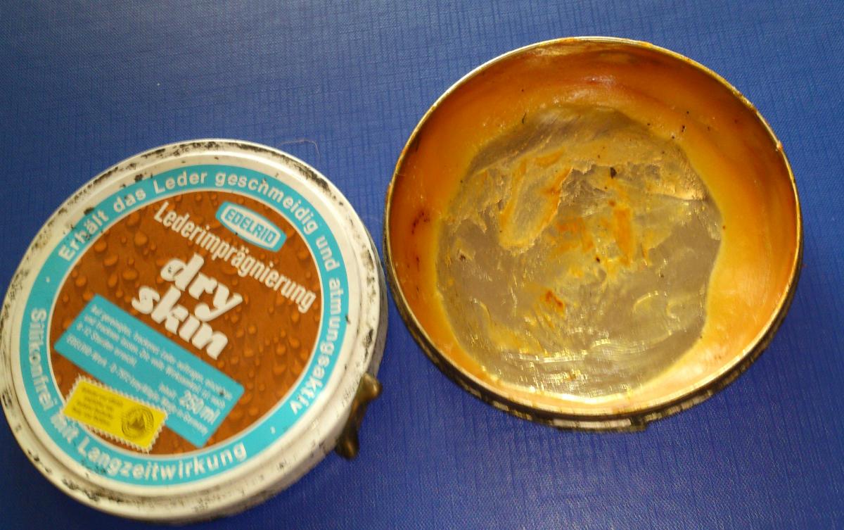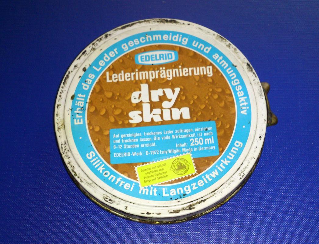 12. Bivoks trekker nok ikke særlig langt inn i skoen. Det er for hardt og må varmes en del før det har muligheter for å trekke inn i læret. Selv når det er flytende vil det ofte stivne med det samme det treffer den kalde skoen. Du kan smelte bivoks og vaselin og blande sammen, men da egner det seg bedre som bartevoks enn som skoimpregnering. Det finnes en del forskjellige impregneringsstoffer for lær som sikkert fungerer bedre. Jeg hadde problemer med lekkasje i sømmen mellom lær og gummi på mina gamle Lundhags sko. Da brukte jeg noe som hette Dryskinn lærimpregnering. Dette var litt voksaktig og jeg maserte det inn med fingrene. Det tok litt tid, men skoene ble helt tette. Jeg finner ikke denne typen på nettet, men Mink oil skal også være bra. Den har jeg ingen erfaring med selv, men jeg vet at det er mange som bruker den. Det er også en type skoimpregnering som heter Nygammal. Den brukte jeg en del av tidligere, men læret blir litt mykt etter en tids bruk og det er ikke sikkert at det alltid er så bra. http://www.fjallprodukter.com/se/articleimage.php?id=6578&image=1005443&fullwidth=0&fullheight=0 Nå fant jeg den gamle boksen med "Dry skin" Jeg vet ikke om den finnes i handelen lenger, men dette er noe av det beste jeg har hatt til å impregnere sko med.