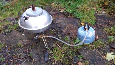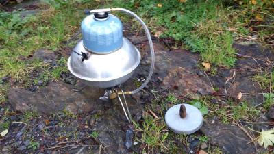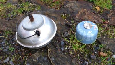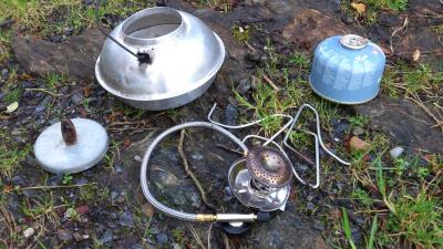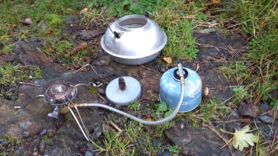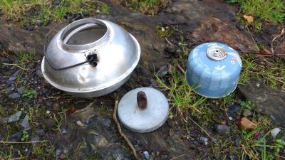 Etter helgens opplevelse med en ufrivillig overnatting ute så tenkte jeg at jeg ville vise frem mitt lille enkle feltkjøkken som fredag kveld ga meg varm mat når jeg trengte det mest. Det består av en gammel aluminiumskjele, en enkel gassbrenner og en liten gassboks. Gassboksen er ikke større enn den må være, men akkurat stor nok til å kunne brukes som lokk på kjelen hvis det skulle bli for kaldt. Varmen fra kjelen øker da trykket i gassboksen slik at det blir god fres på brenneren.