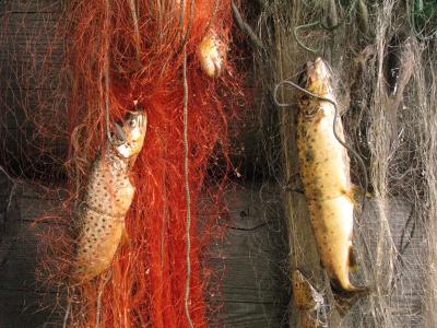 Jeg har planlagt en tur til helgen. Kanotur med min danske venn som har et stort ønske om å dra ut for å fange fisk, hente sopp og tilberede maten ute på bål eller primus. For å safe litt så tenkte jeg å ta en tur i kveld og sette ut et par ørretgarn. Det er sikkert 30 år siden jeg fikk tillatelse av grunneieren til å fiske med garn her, men han er borte for lenge lenge siden og nå er det hans barnebarn som er "konge på haugen". Hun har satt opp skilt med "salg av fiskekort", men det har jeg aldri sett. Er det riktig av meg å bare gjøre "pene miner til slett spill" og fortsette å fiske eller burde jeg prate med henne og risikere at fisketillatelsen blir inndratt? Jeg fisker jo på "gudegitte gaver". Ingen har lagt to pinner i kors for å gjøre noe som helst verken for fisken eller fiskerne, og ingen driver lenger fiske som næring eller attåtnæring i dette området. Gamlefar fisket røye hver høst som han solgte til en fiskehandler, men nå er det visst ingen som vil ha denne fisken lenger.